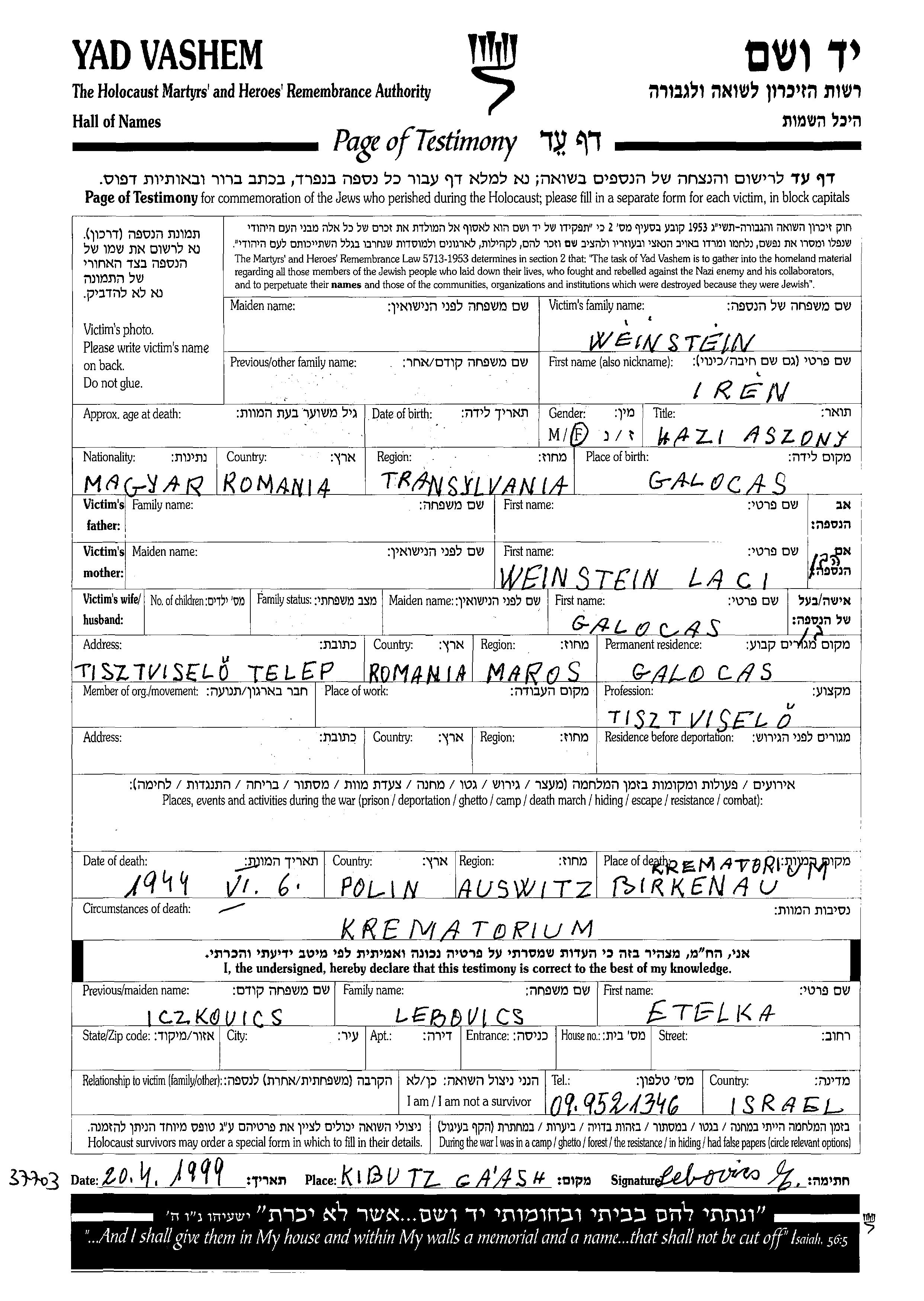 Ирен Вейнштейн, место рождения: Галоцаш, Румыния. Отец: Лаци. Клерк. Холост / не замужем. Место жительства до войны: Галоцаш, Румыния. Место во время войны: Галоцаш, Румыния.