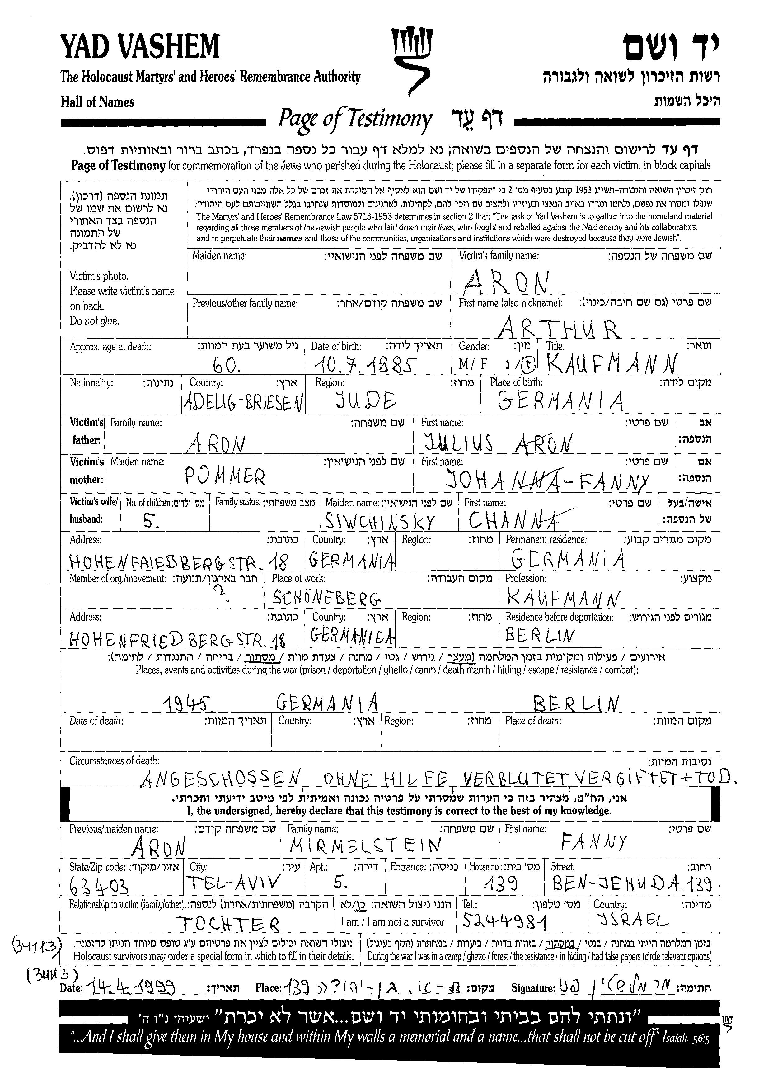 Артур Арон, место рождения: Бризен, Германия. Отец: Юлиус, mать:Фанни Йоханна, девичья фамилия Поммер. Торговец / торговка. Женат / замужем. Место жительства до войны: Берлин, Германия. Место во время войны: Берлин, Германия.