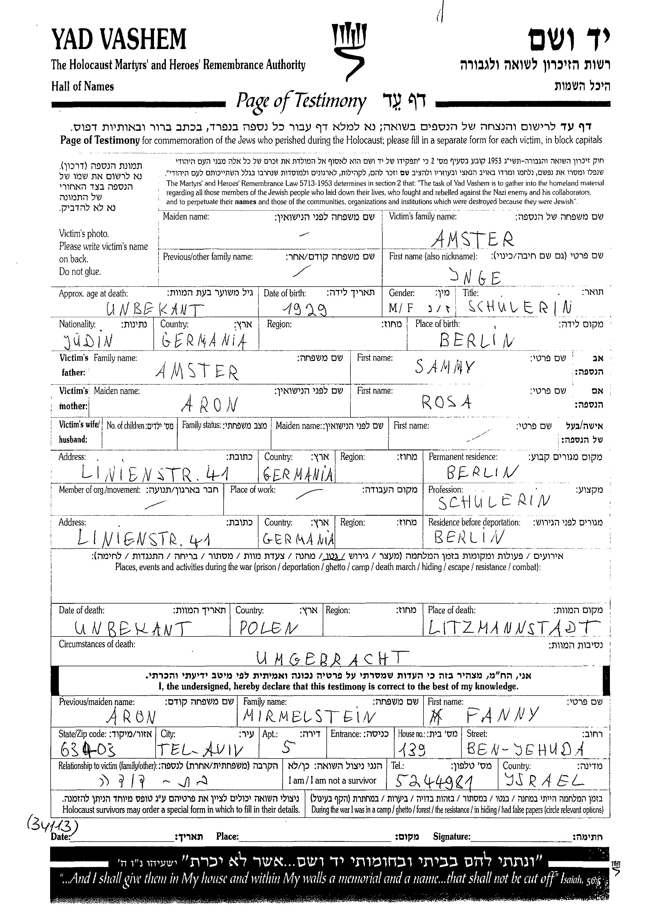 Инге Амстер, место рождения: Берлин, Германия. Отец: Самми, mать:Роза, девичья фамилия Арон. Ученик / ученица. Подросток. Место жительства до войны: Берлин, Германия. Место во время войны: Берлин, Германия.
