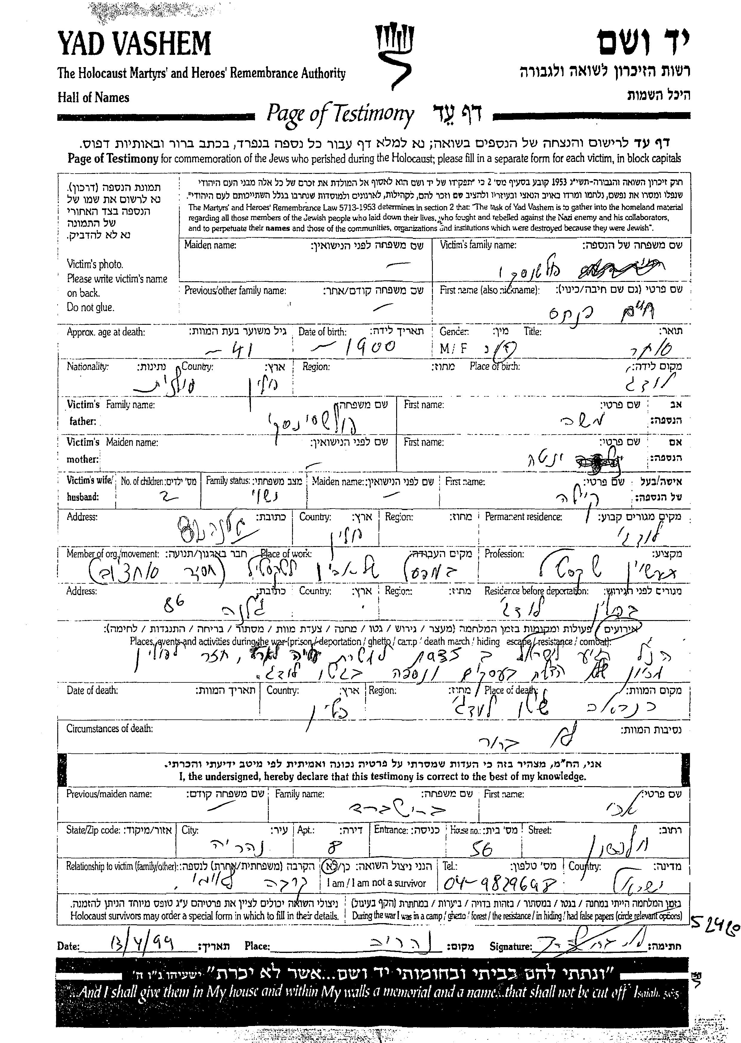Польшански Пинхас Хаим 1900 Лодзь, Польша Лист свидетельских показаний