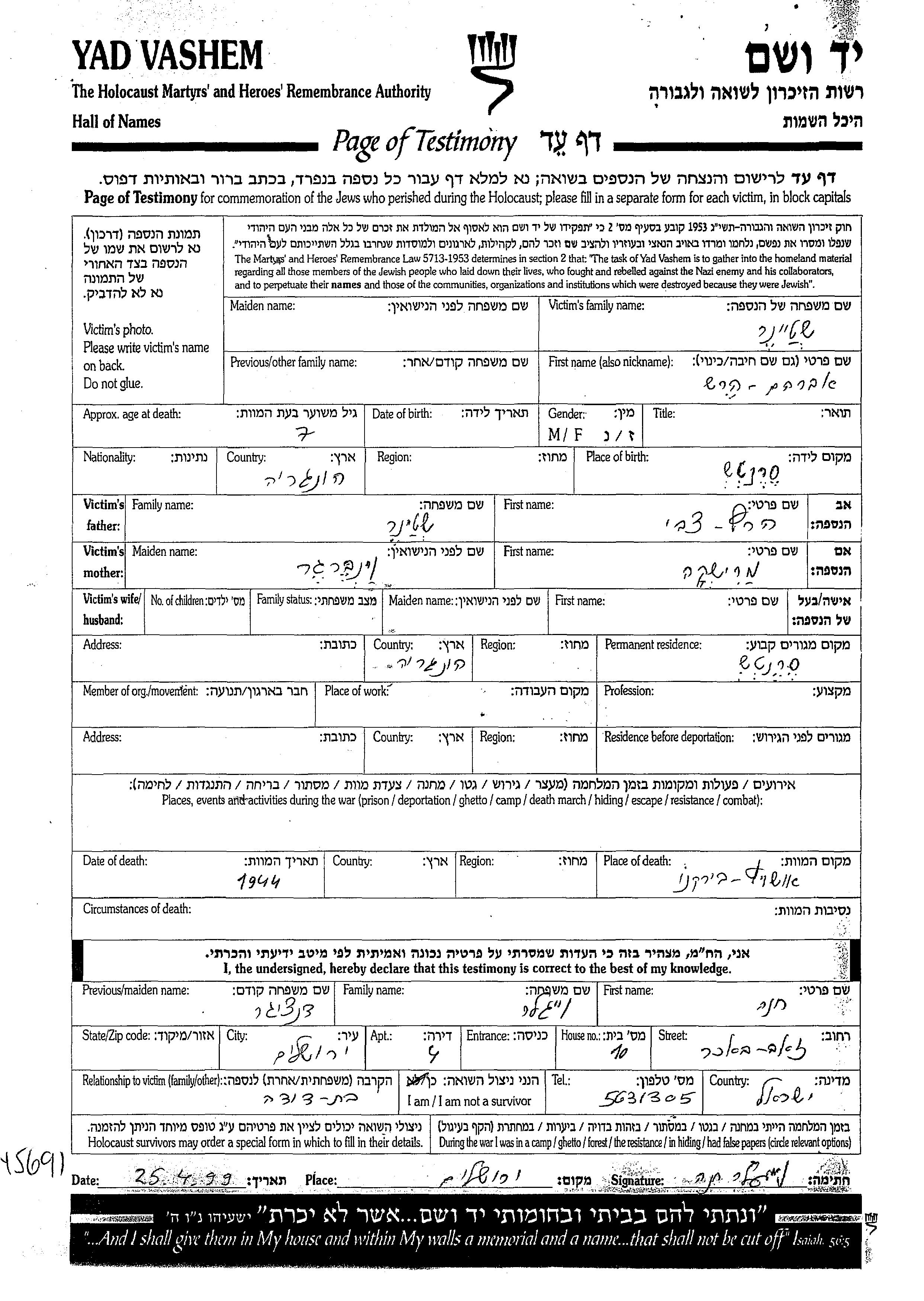 Яд Вашем - Листы свидетельских показаний Мемориального фонда