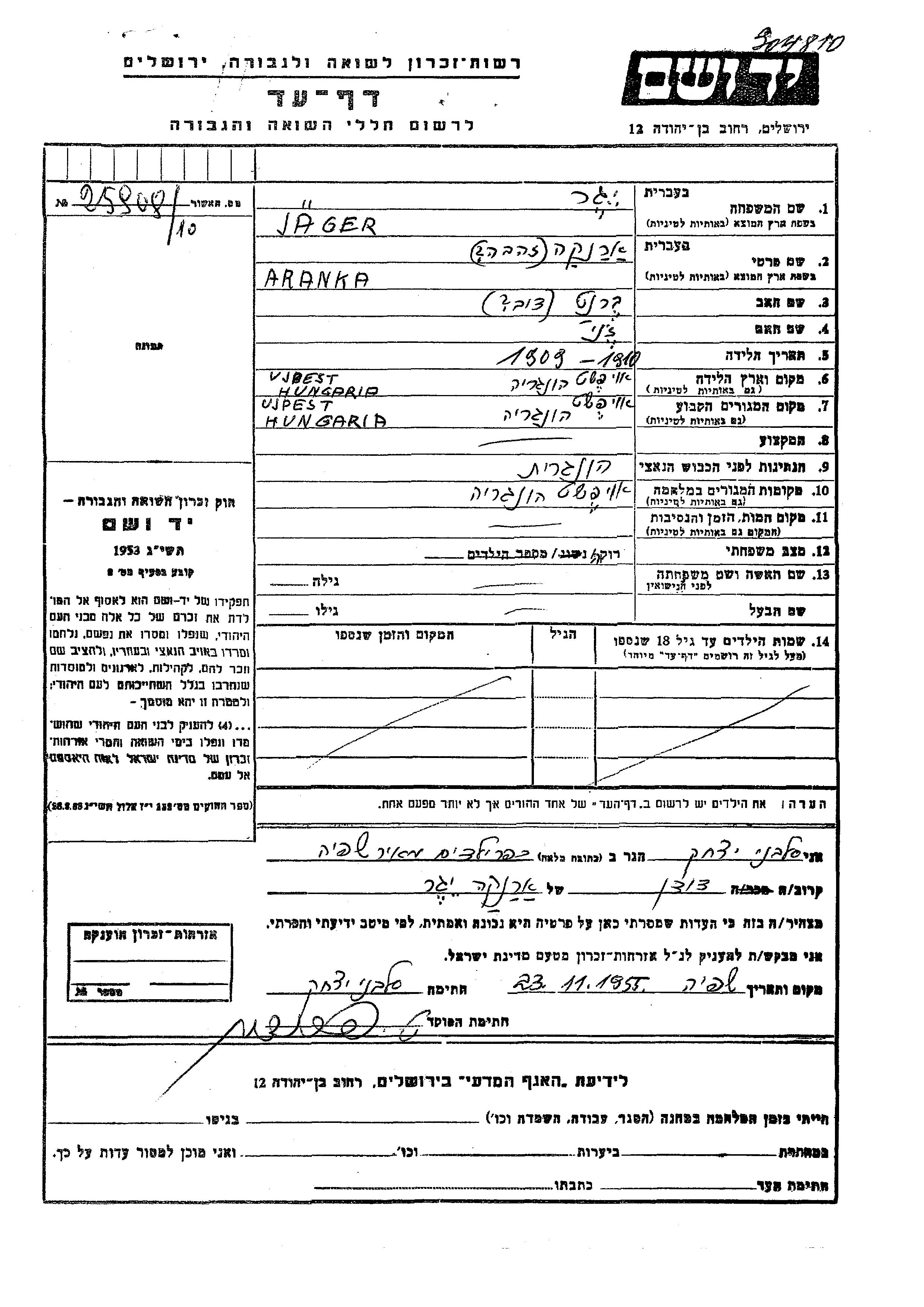 Аранка Захава Ягер, место рождения: Уйпешт, Венгрия. Отец: Бернат Дов, mать:Жени. Холост / не замужем. Место жительства до войны: Уйпешт, Венгрия. Место во время войны: Уйпешт, Венгрия.