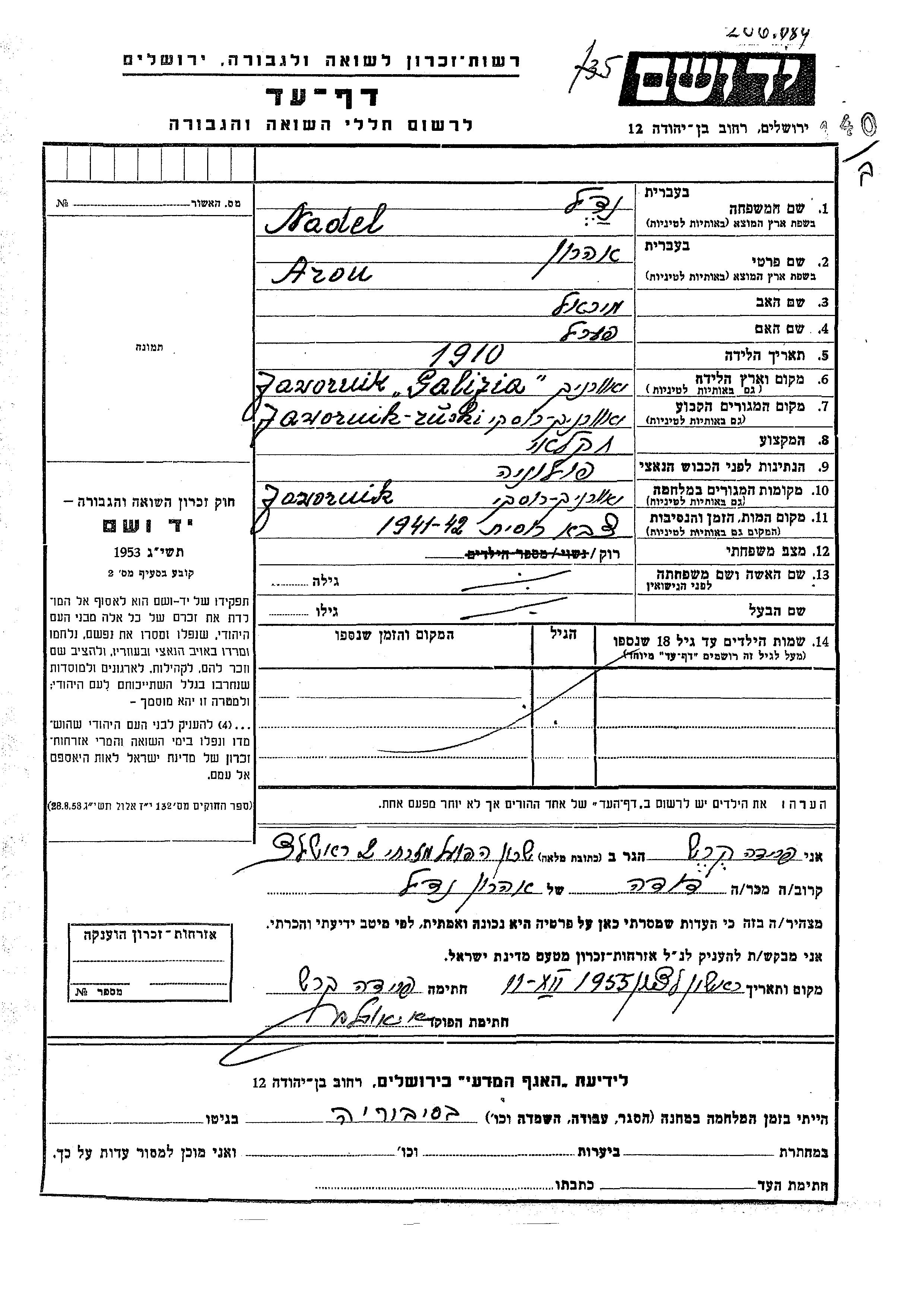 Арон Надель, место рождения: Яворник, Польша. Отец: Михаэль, mать:Перл. Земледелец / земледелица. Холост / не замужем. Место жительства до войны: Яворник, Польша. Место во время войны: Яворник, Польша.