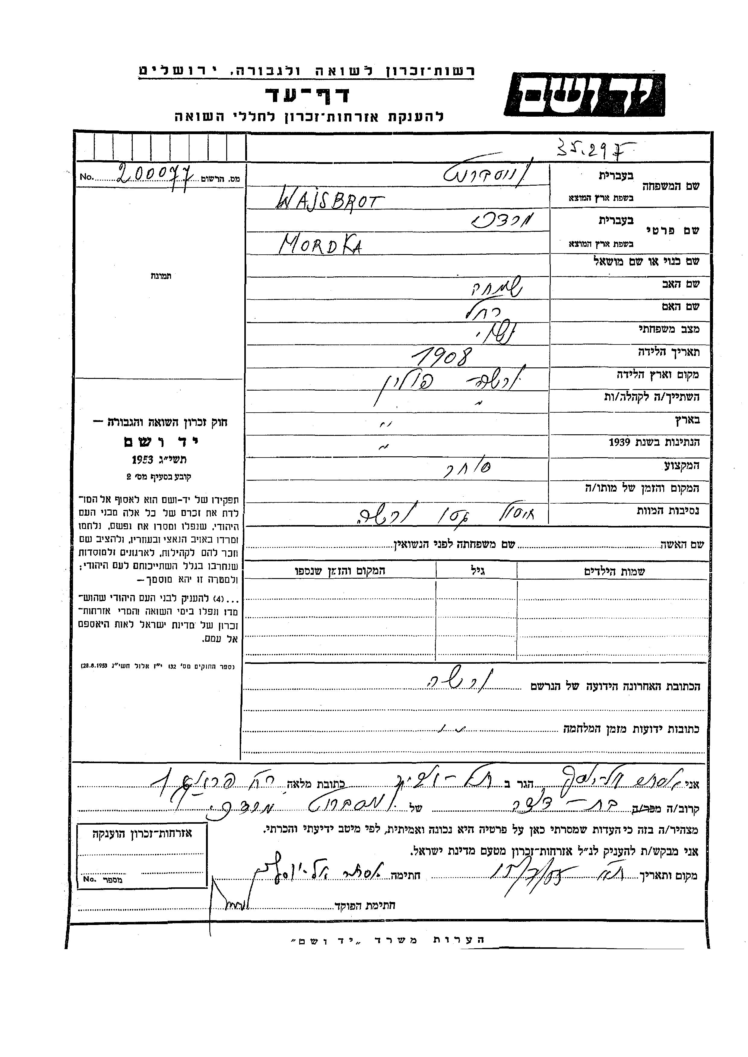 Мордка Вайсброт, место рождения: Варшава, Польша. Отец: Симха, mать:Рахель. Торговец / торговка. Женат / замужем. Место жительства до войны: Варшава, Польша. Место во время войны: Варшава, Польша.