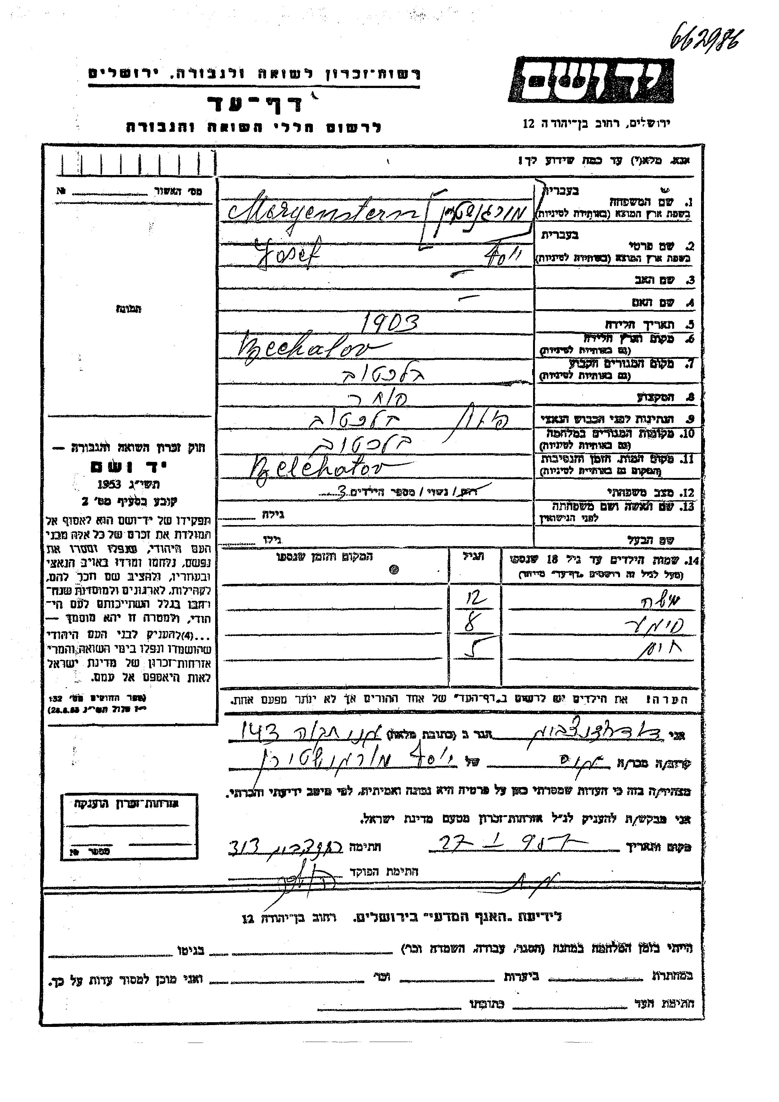 Моргенштейн Иосеф 1903 Белхатув, Польша Лист свидетельских показаний