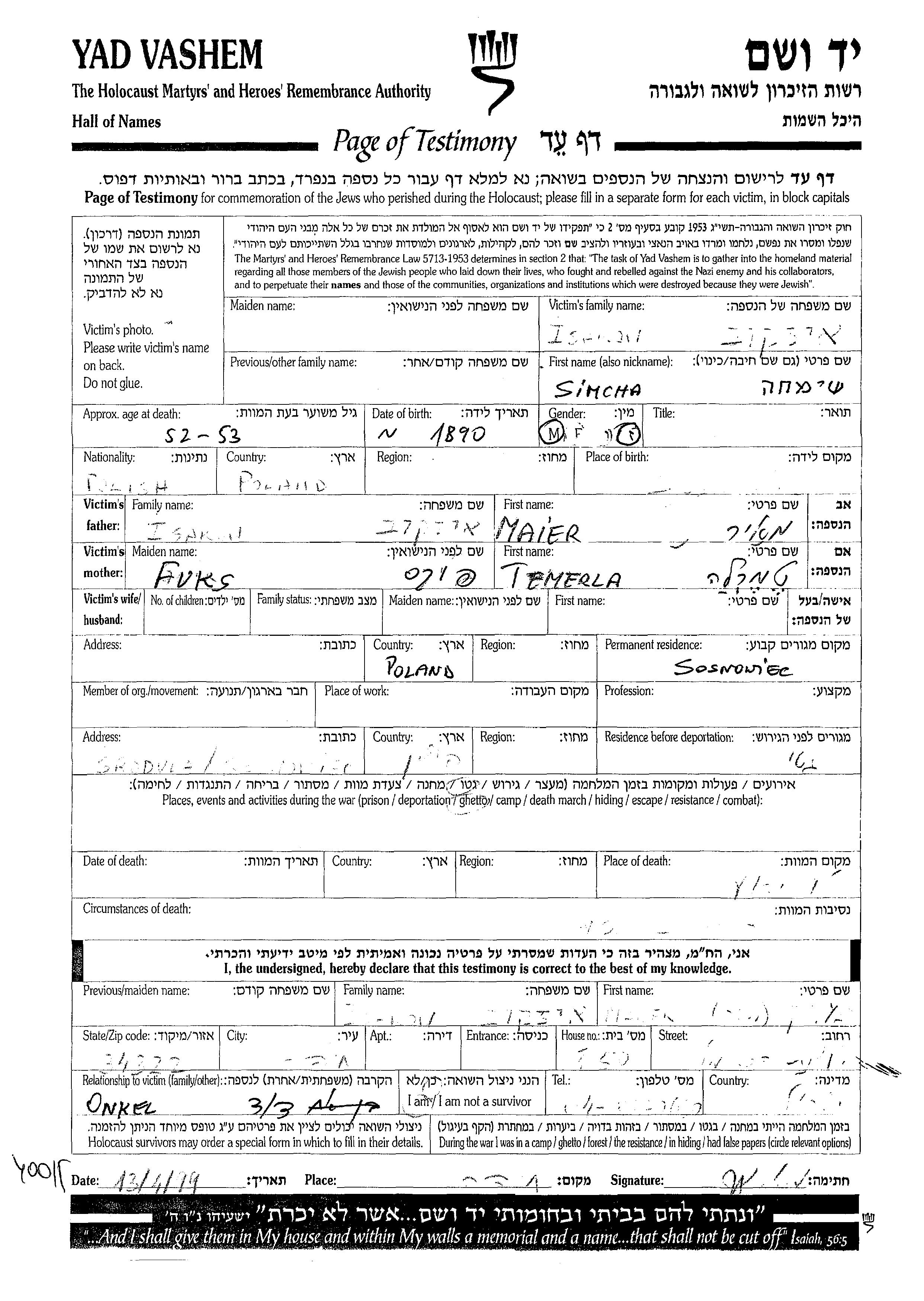 Симха Изаков, место рождения: Польша. Отец: Маиер, mать:Темерла, девичья фамилия Фукс. Место жительства до войны: Сосновец, Польша. Место во время войны: Sosnowiec Srodula, Польша.