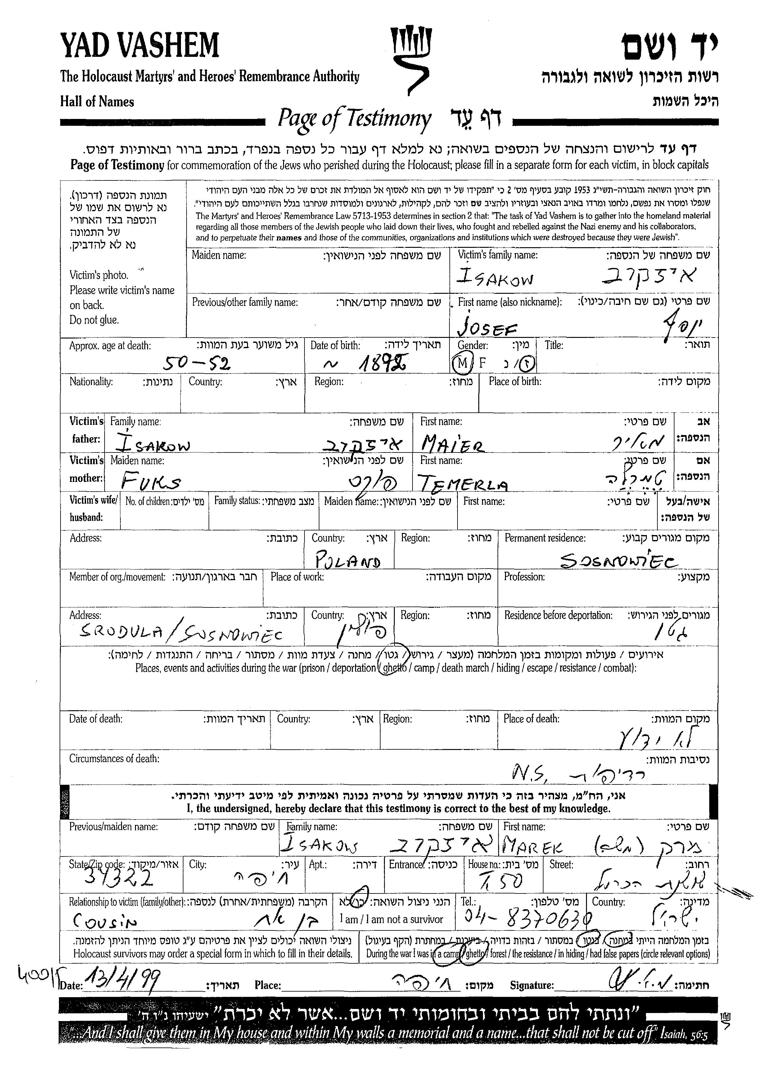 Йосеф Изаков. Отец: Меир, mать:Темерла, девичья фамилия Фукс. Место жительства до войны: Сосновец, Польша. Место во время войны: Sosnowiec Srodula, Польша.