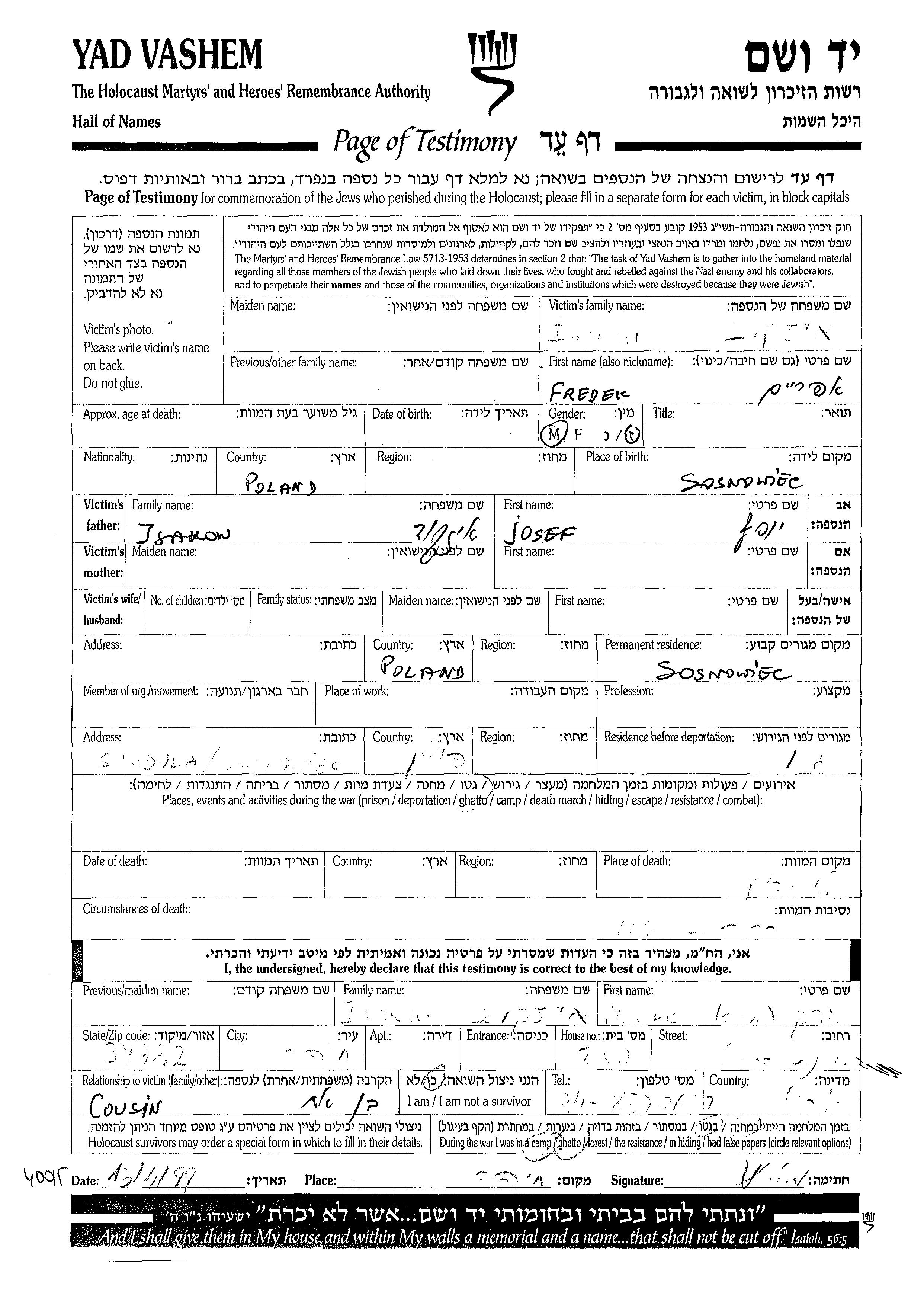 Изаков Эфраим Фредек Сосновец, Польша Лист свидетельских показаний