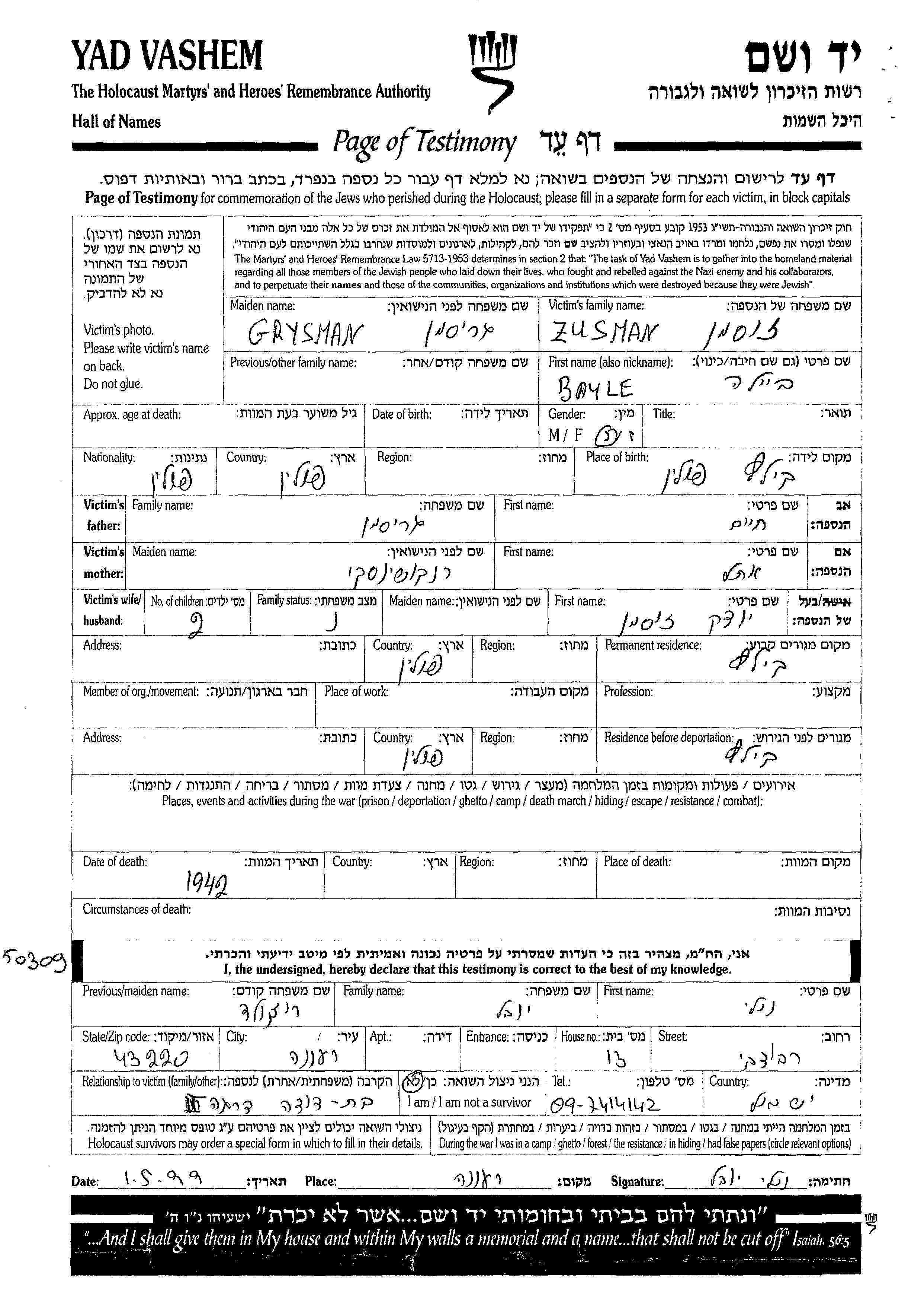 Байле Зусман, девичья фамилия Грисман, место рождения: Кельце, Польша. Отец: Хаим, mать:Этель, девичья фамилия Ренкошински. Женат / замужем. Место жительства до войны: Кельце, Польша. Место во время войны: Кельце, Польша.