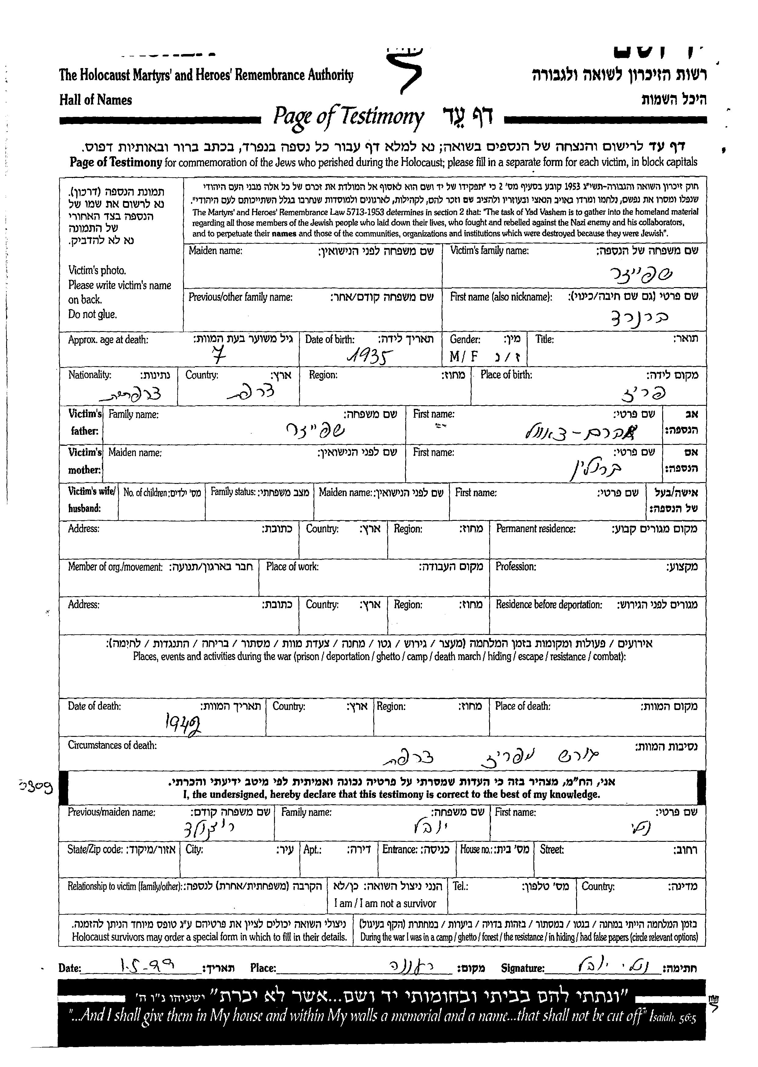 Шпейзер Бернард 1935 место не указано, Лист свидетельских показаний