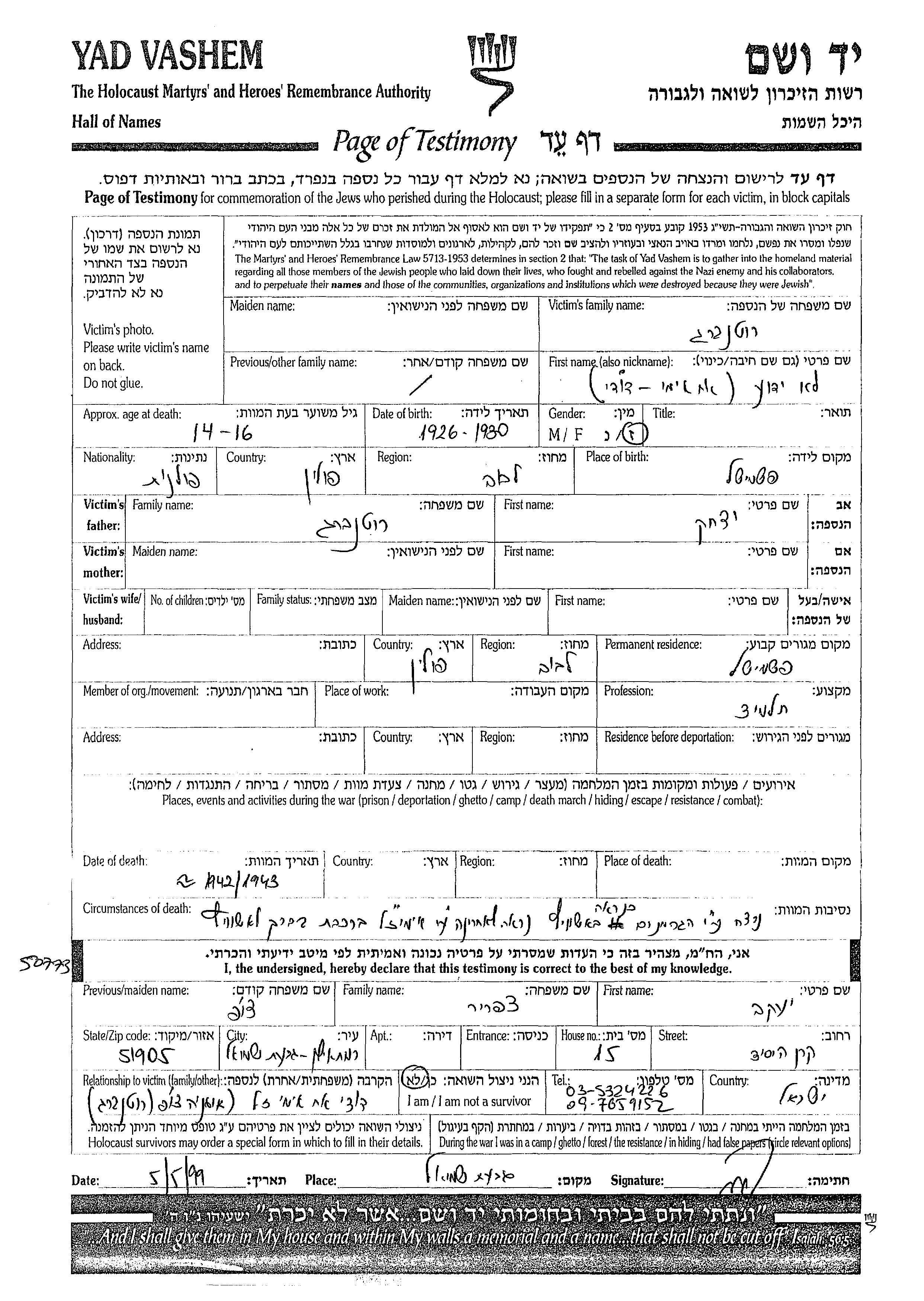Яд Вашем - Листы свидетельских показаний Мемориального фонда