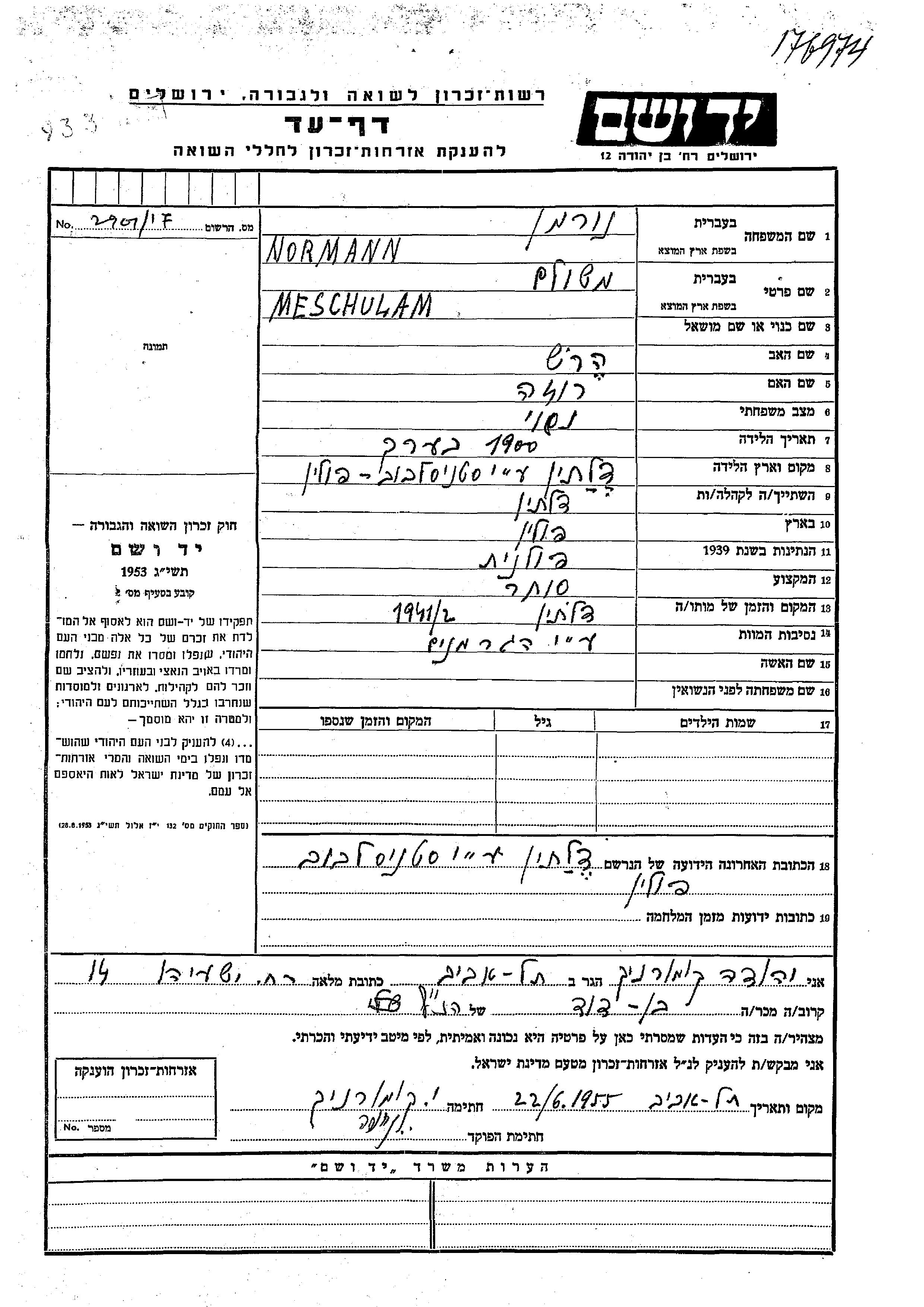 Мешулам Норманн Нурман, место рождения: Делятин, Польша. Отец: Герш, mать:Роза. Торговец / торговка. Женат / замужем. Место жительства до войны: Делятин, Польша.