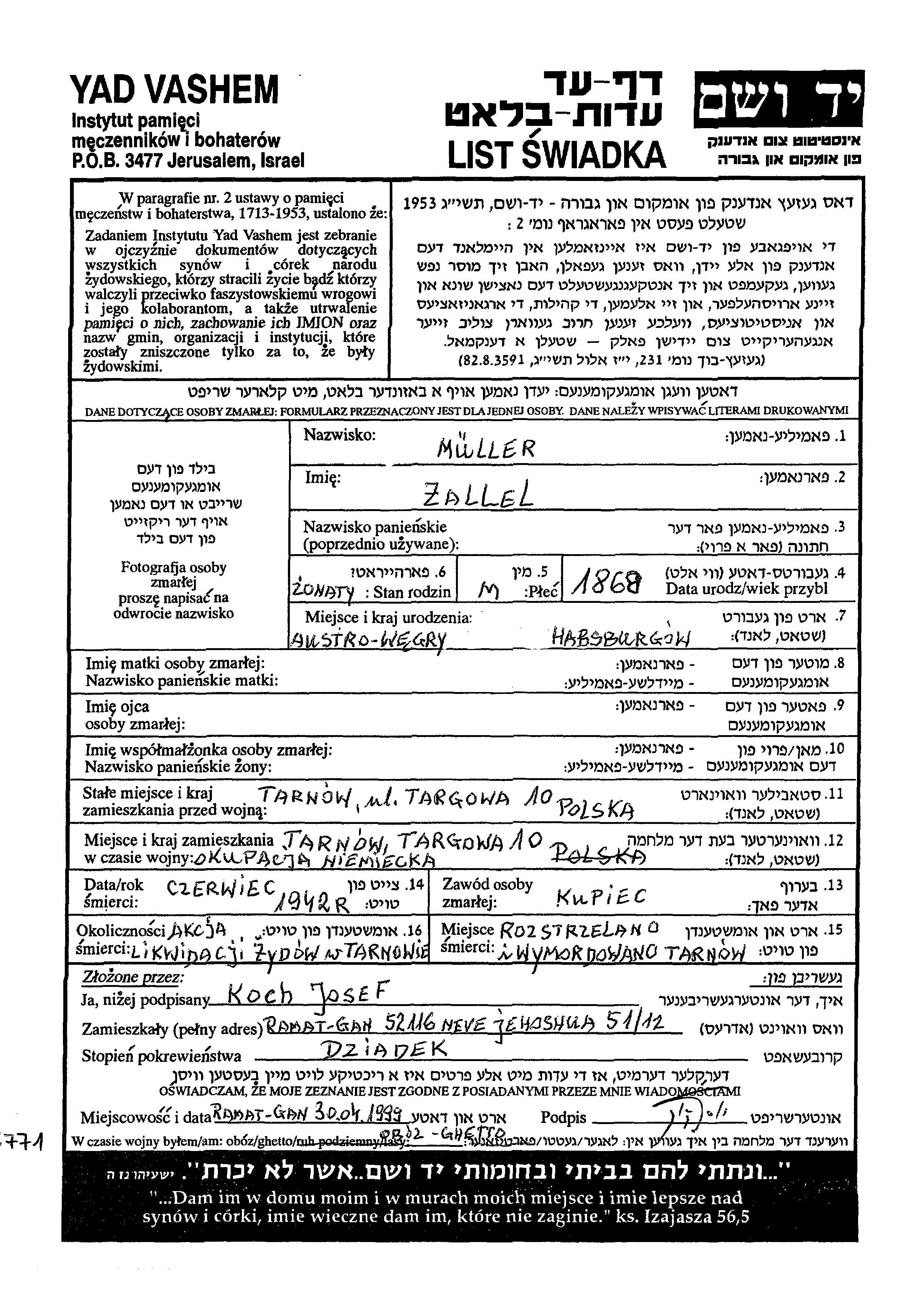 Цаллель Мюллер, место рождения: Австро-Венгерская Империя. Торговец / торговка. Женат / замужем. Место жительства до войны: Тарнув, Польша. Место во время войны: Тарнув, Польша.