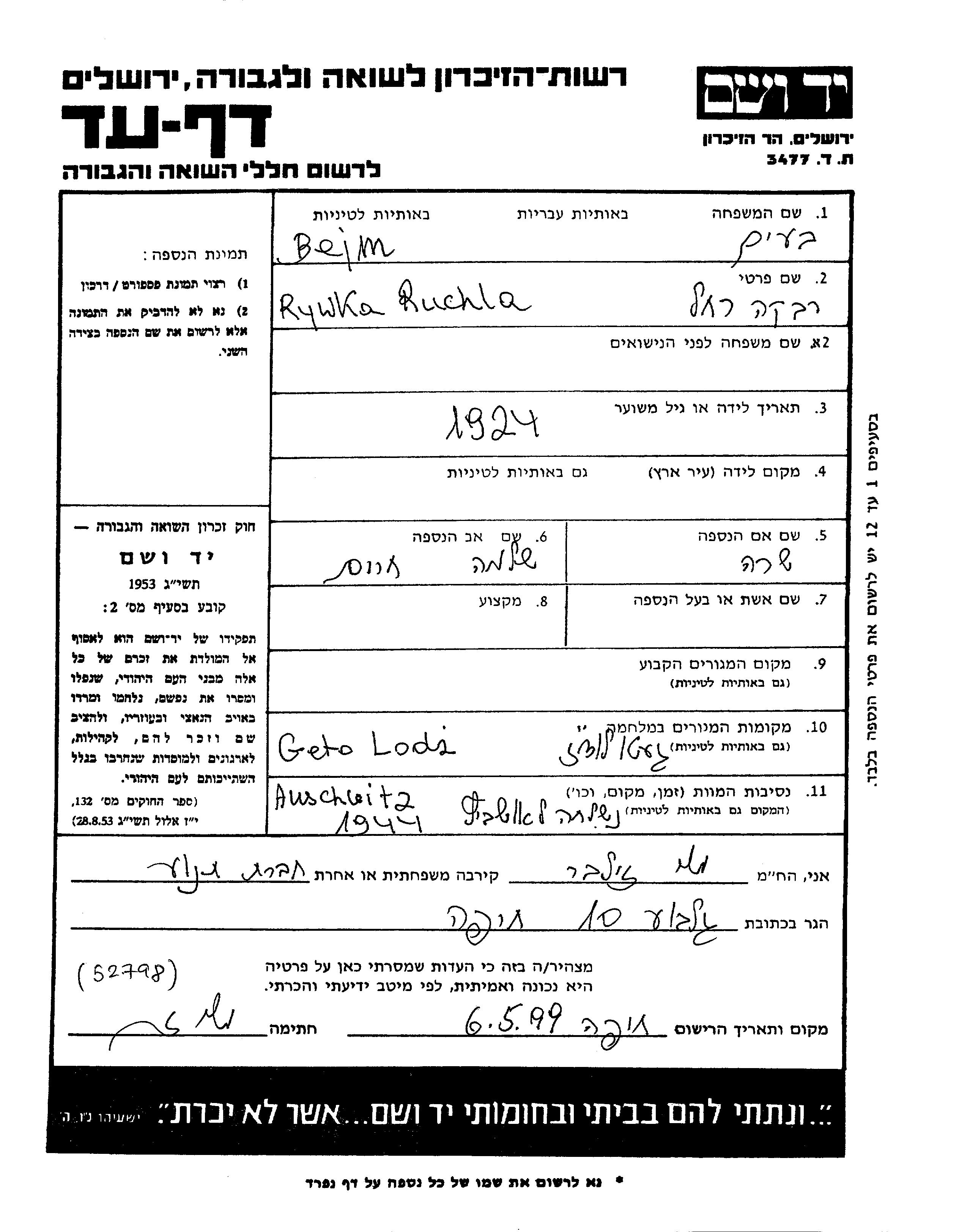 Ривка Рухла Бейм. Отец: Хаим Шломо, mать:Сара. Место во время войны: Лодзь, Польша.