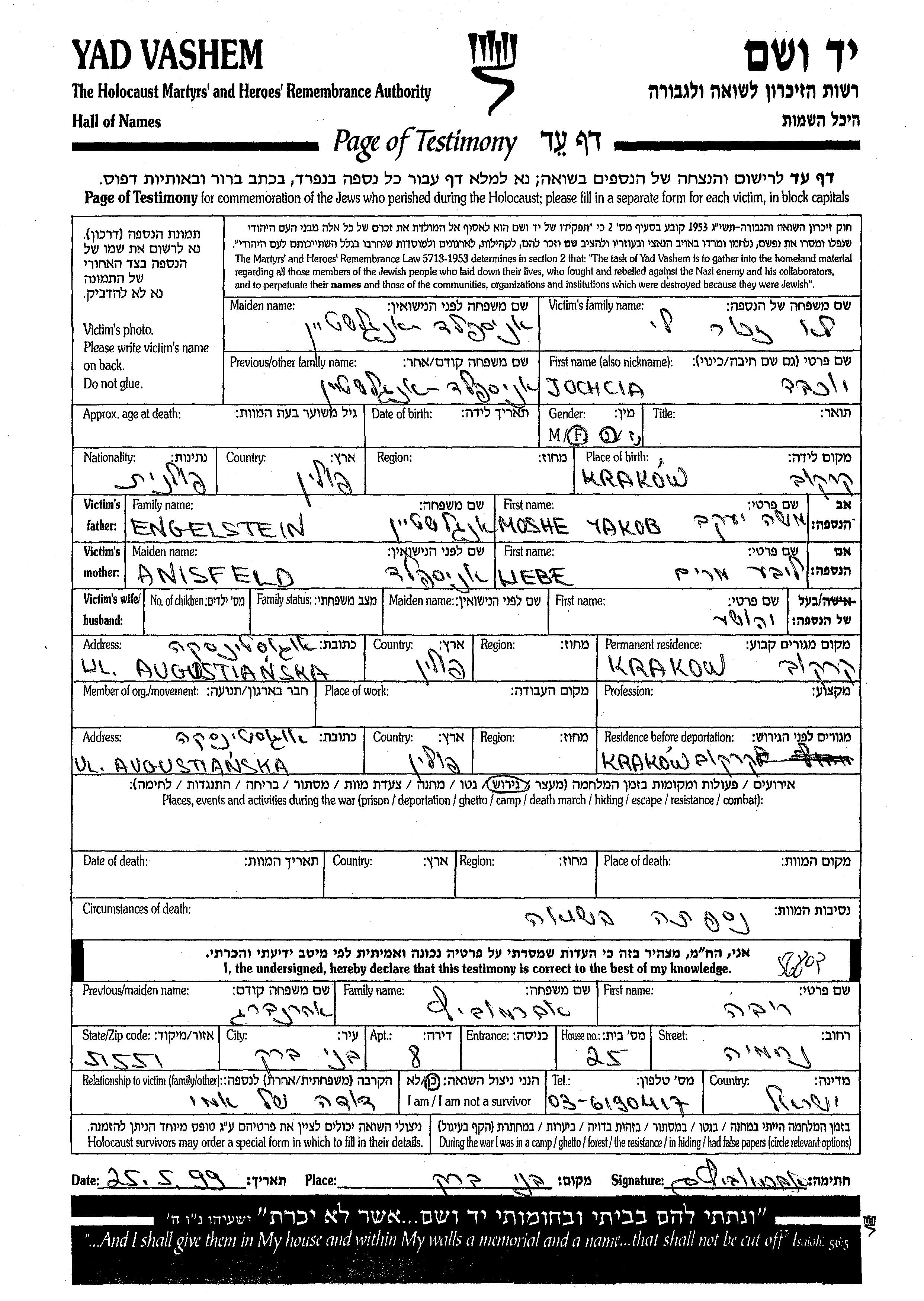 Йохевед Фамилия неизвестна, девичья фамилия Энгельштейн, место рождения: Краков, Польша. Отец: Яков Моше, mать:Либе Мирьям, девичья фамилия Анисфельд. Женат / замужем. Место жительства до войны: Краков, Польша. Место во время войны: Краков, Польша.