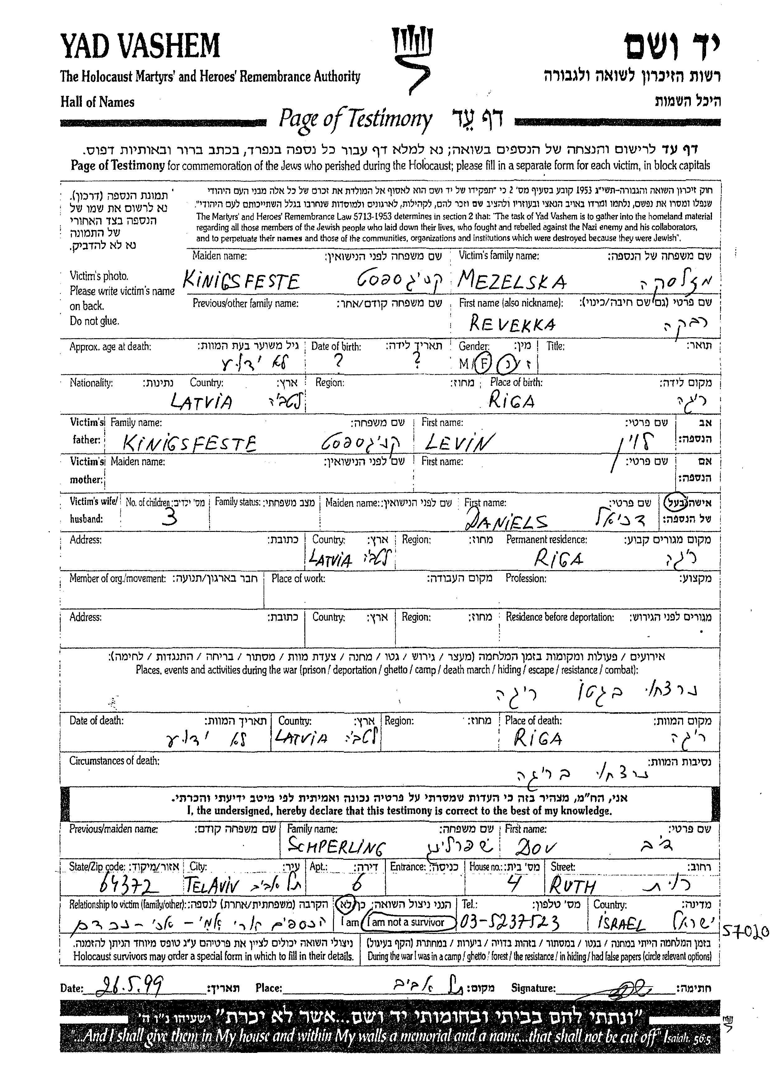 Мезельска Ривка Рига, Латвия Лист свидетельских показаний