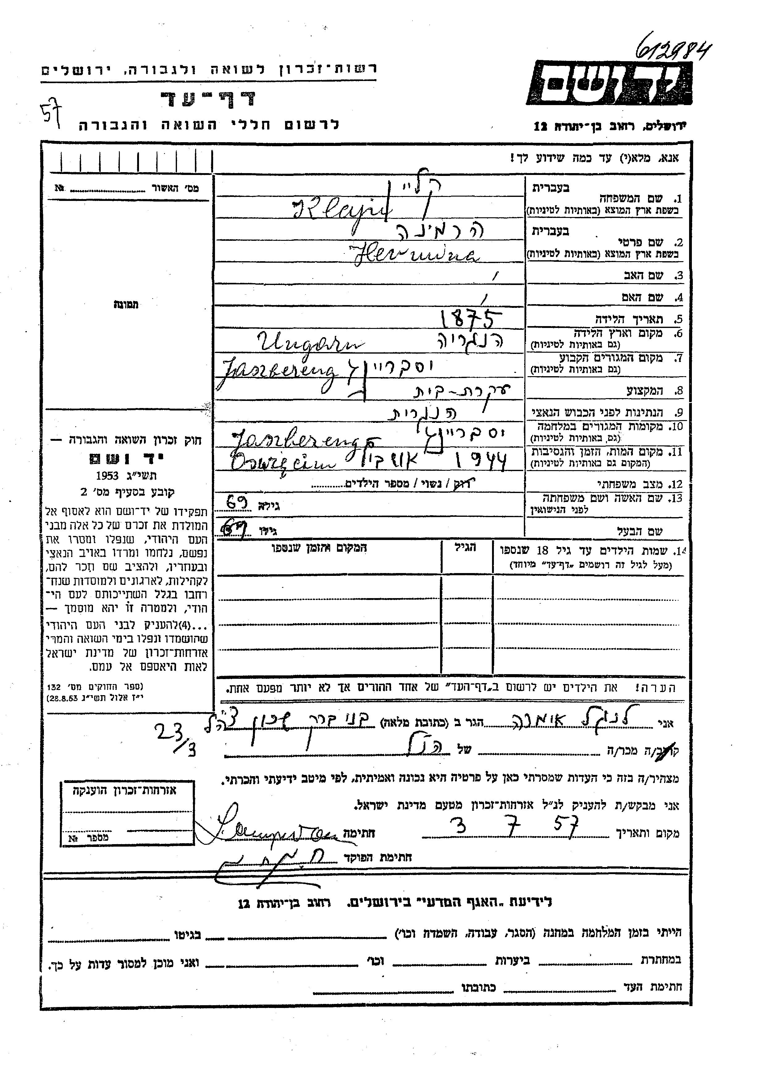 Клейн Хермина 1875 Ясберень, Венгрия Лист свидетельских показаний