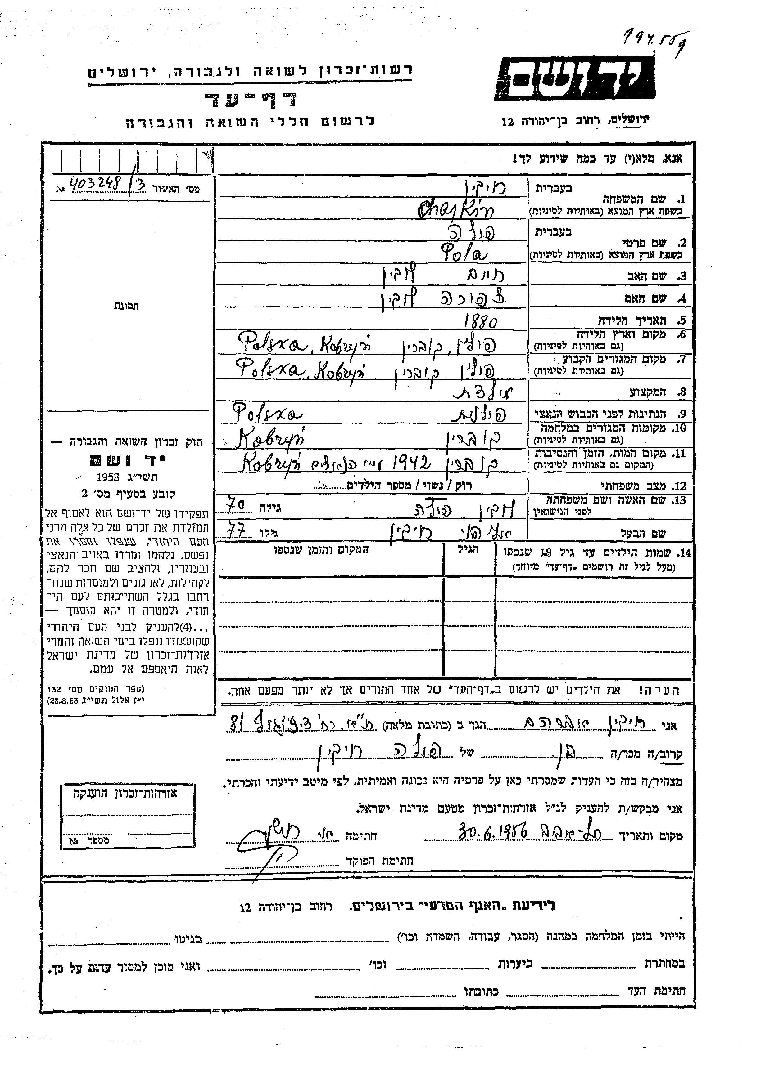 Яд Вашем - Листы свидетельских показаний Мемориального фонда