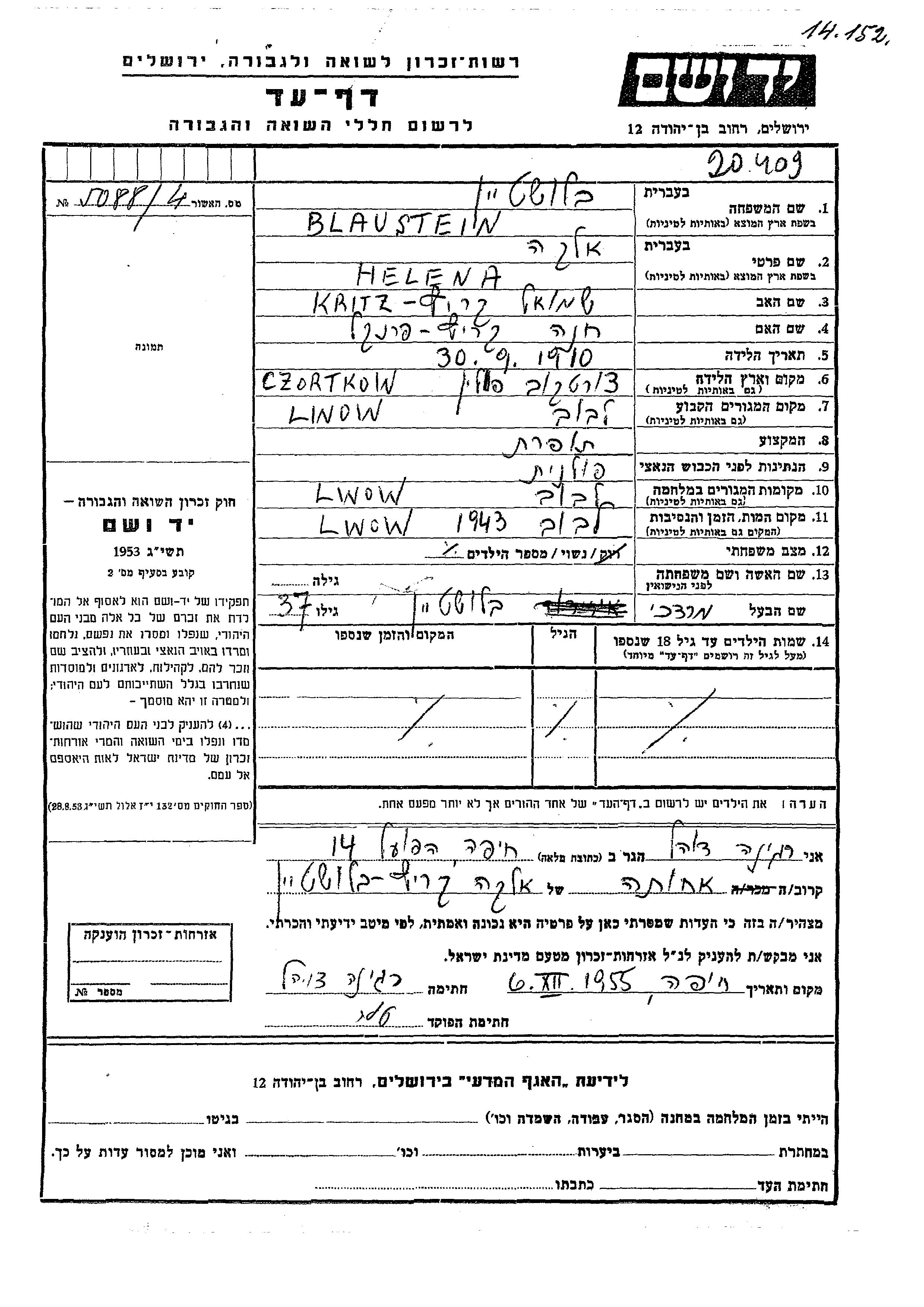 Блауштайн Элена 1910 Львов, Польша Лист свидетельских показаний