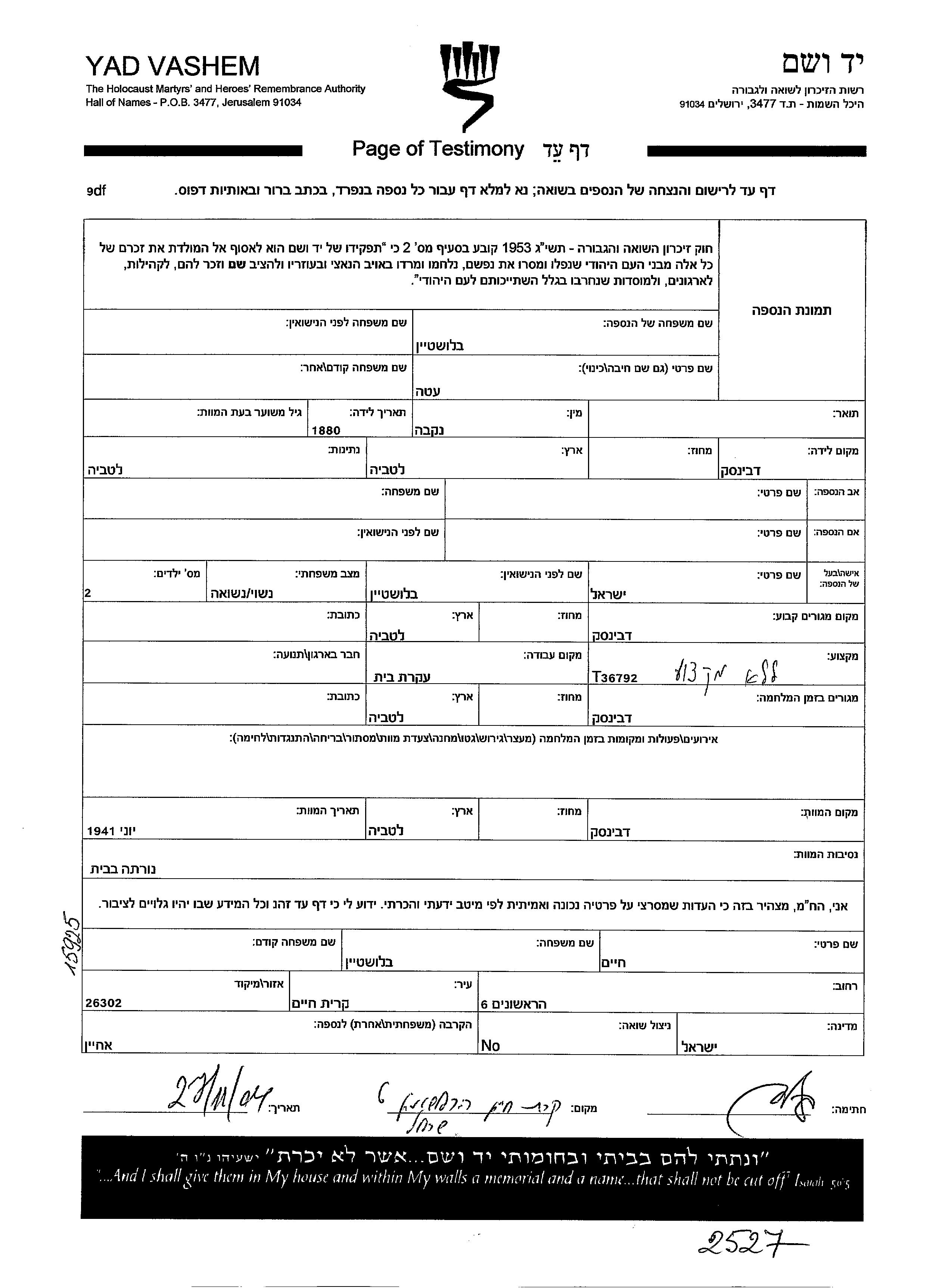Блуштейн Эта 1880 Двинск, Латвия Лист свидетельских показаний (электронный, с подписью)