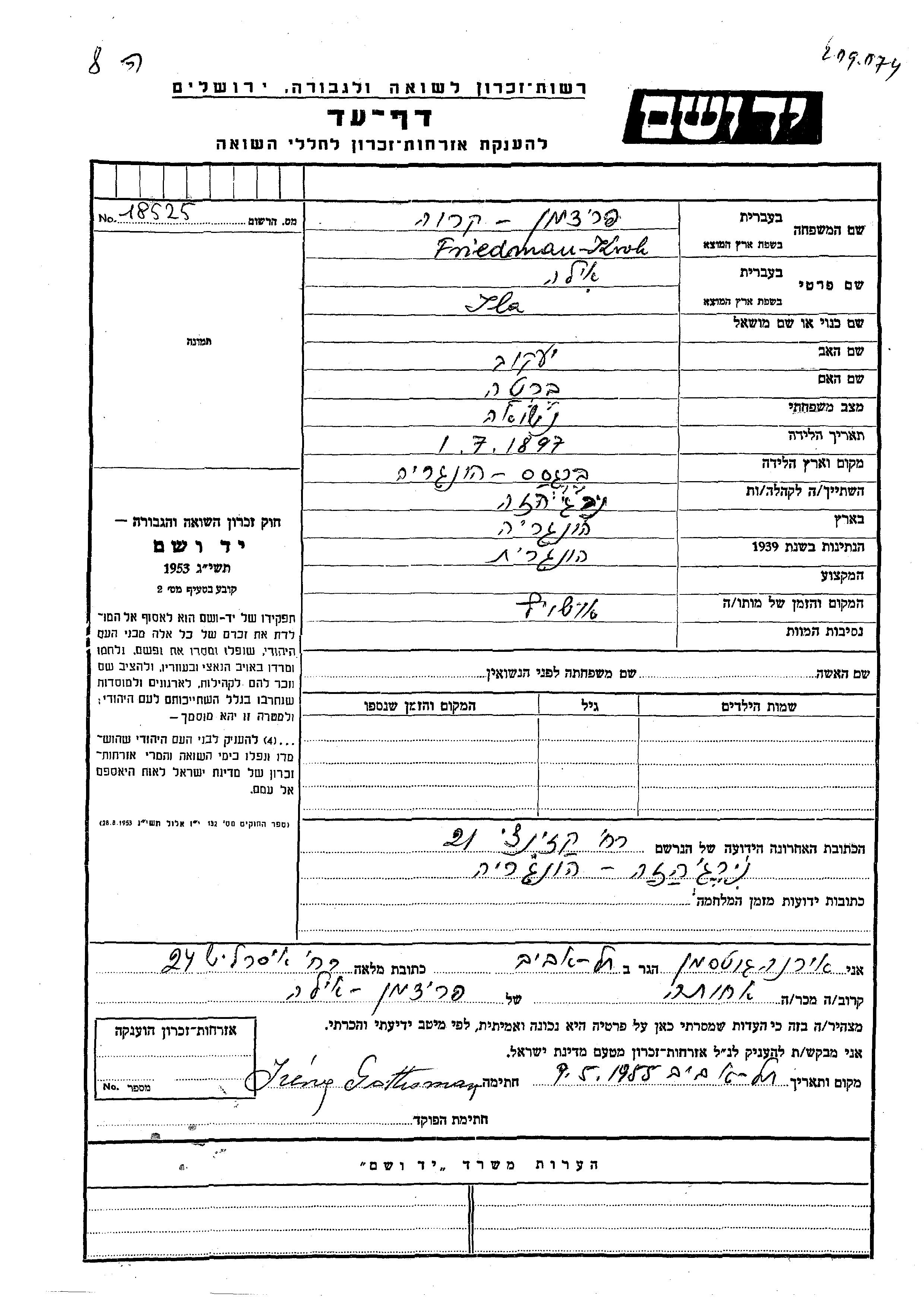 Фридман Крох Кру Ила 1897 Берегсас, Чехословакия Лист свидетельских показаний