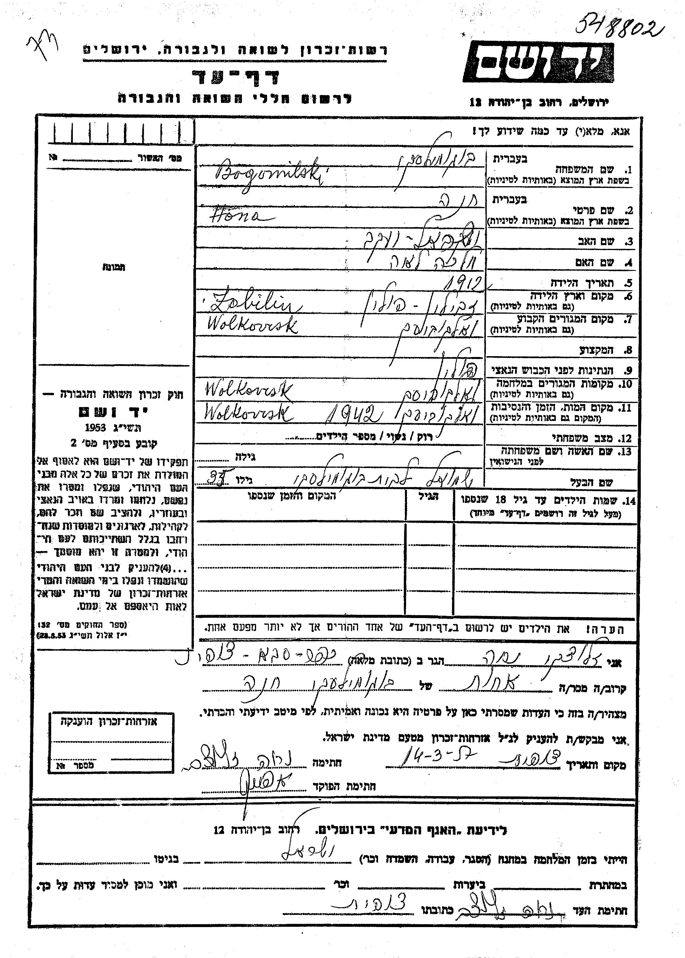 Хона Хана Богомильски, место рождения: Zabilin, Польша. Отец: Исраэль Яков, mать:Малка Лея. Женат / замужем. Место жительства до войны: Волковыск, Польша. Место во время войны: Волковыск, Польша.
