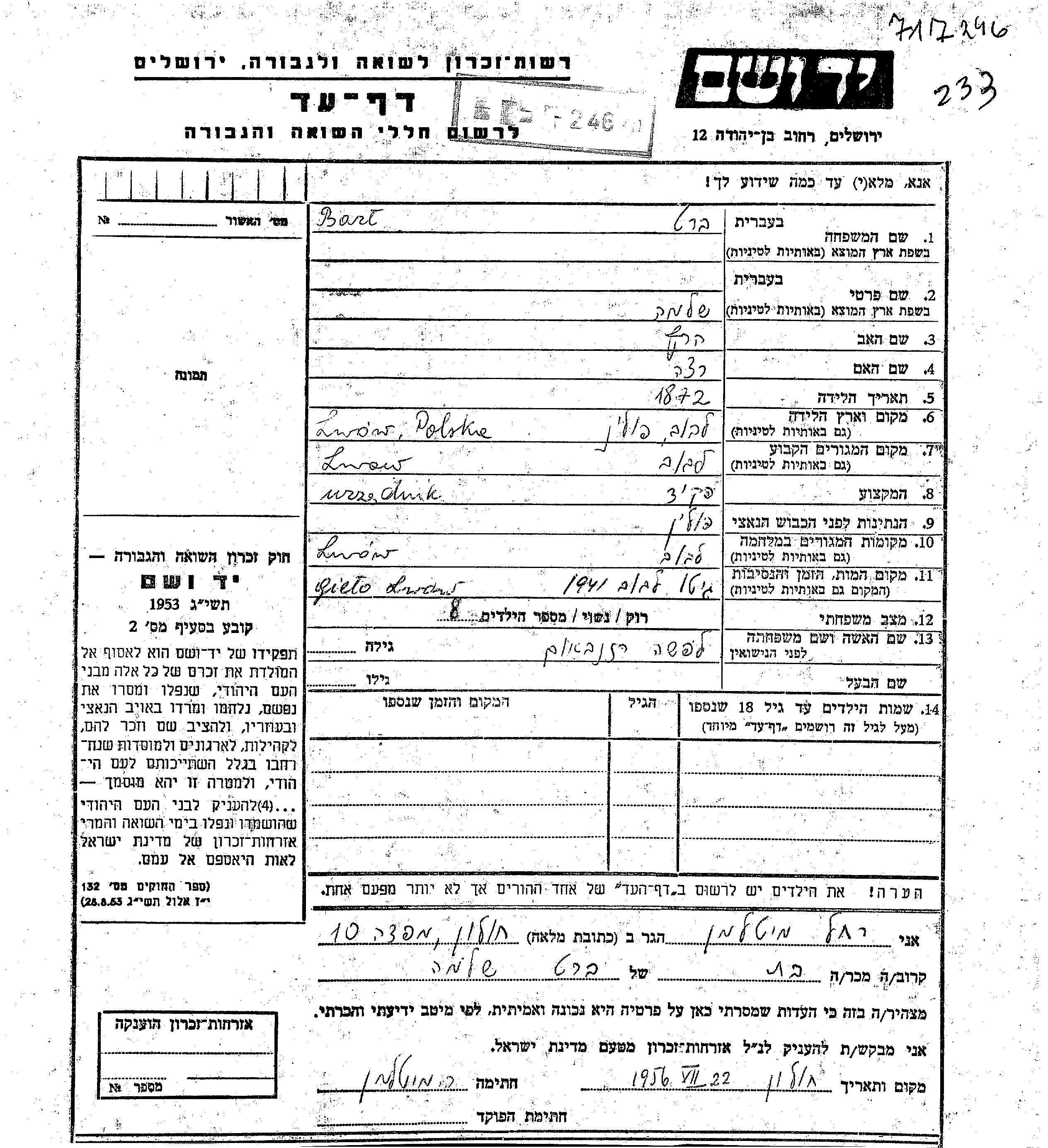 Шломо Барт, место рождения: Львов, Польша. Отец: Херц, mать:Раца. Клерк. Женат / замужем. Место жительства до войны: Львов, Польша. Место во время войны: Львов, Польша.