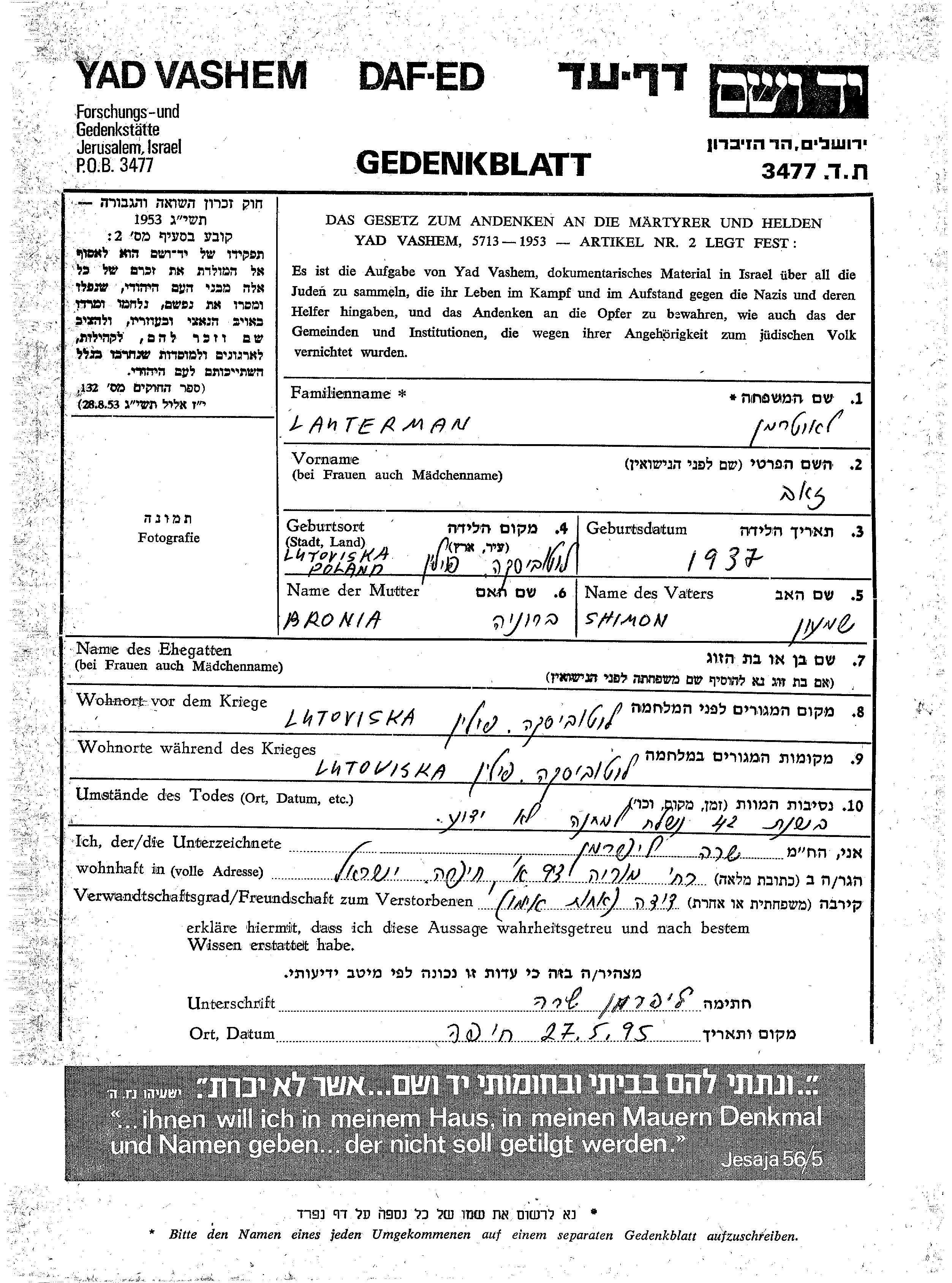 Зеев Лаутерман, место рождения: Лютовиска, Польша. Отец: Шимон, mать:Броня. Холост / не замужем. Место жительства до войны: Лютовиска, Польша. Место во время войны: Лютовиска, Польша.