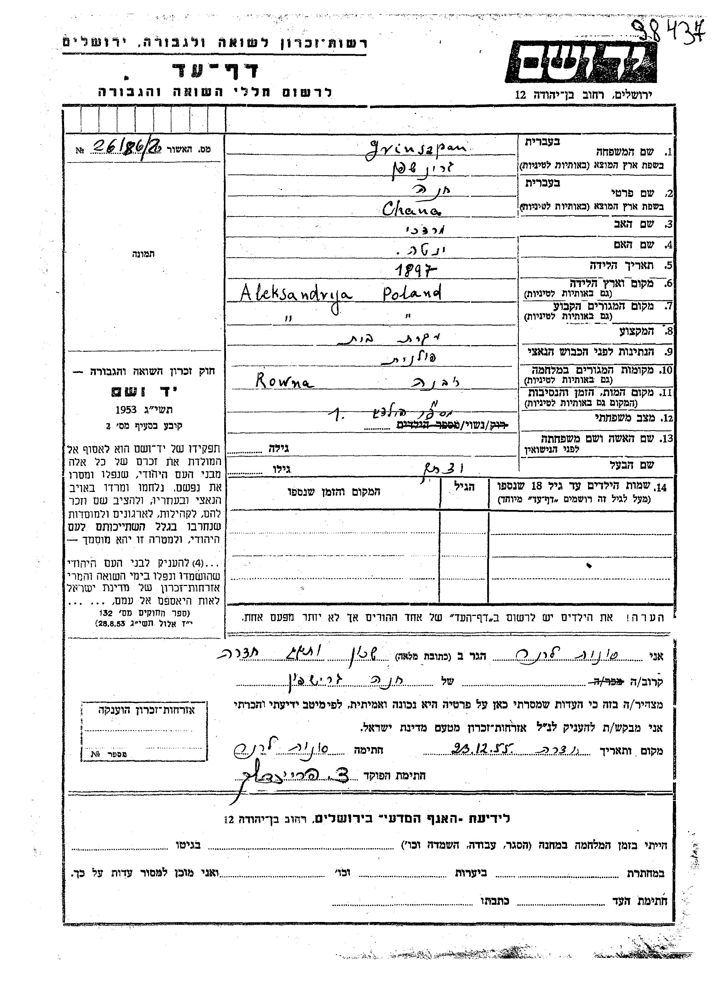 Хана Гриншпан, место рождения: Александрия, Польша. Отец: Мордехай, mать:Ента. Домохозяйка. Женат / замужем. Место жительства до войны: Александрия, Польша. Место во время войны: Ровно, Польша.