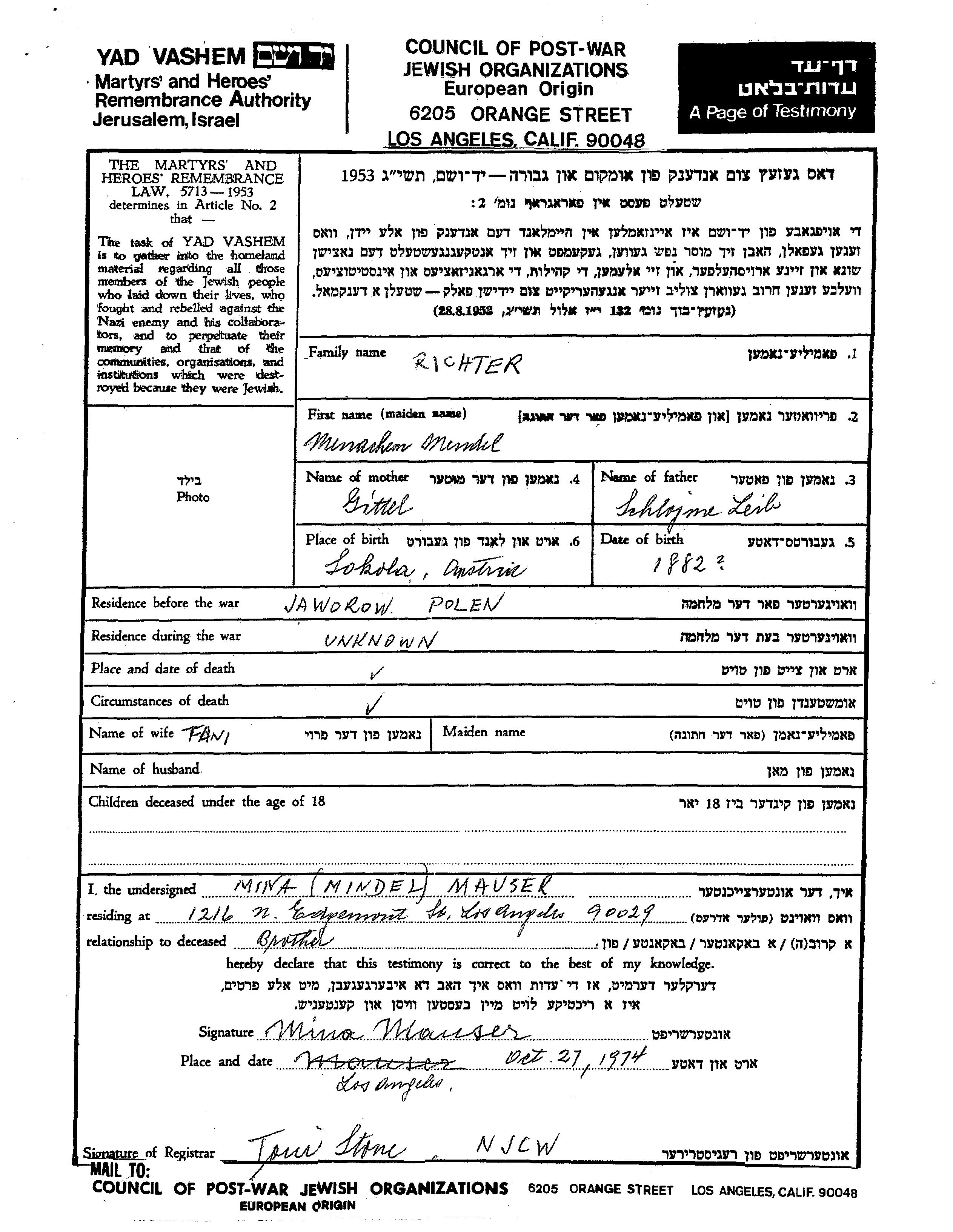 Менахем Мендиль Рихтер, место рождения: Соколя, Польша. Отец: Шлойме Лейб, mать:Гиттель. Место жительства до войны: Яворов, Польша.