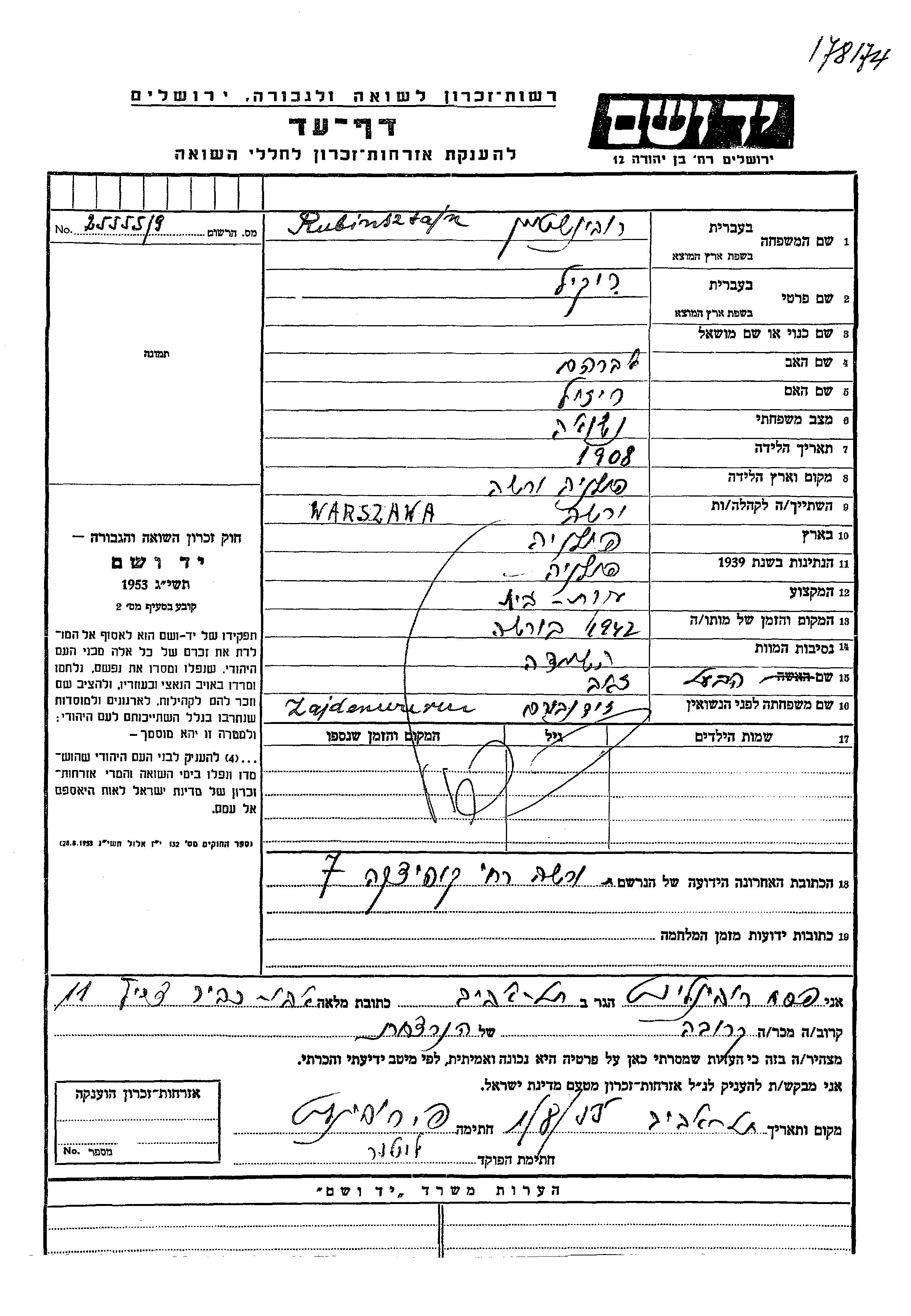 Рубинштайн Рикел 1908 Варшава, Польша Лист свидетельских показаний