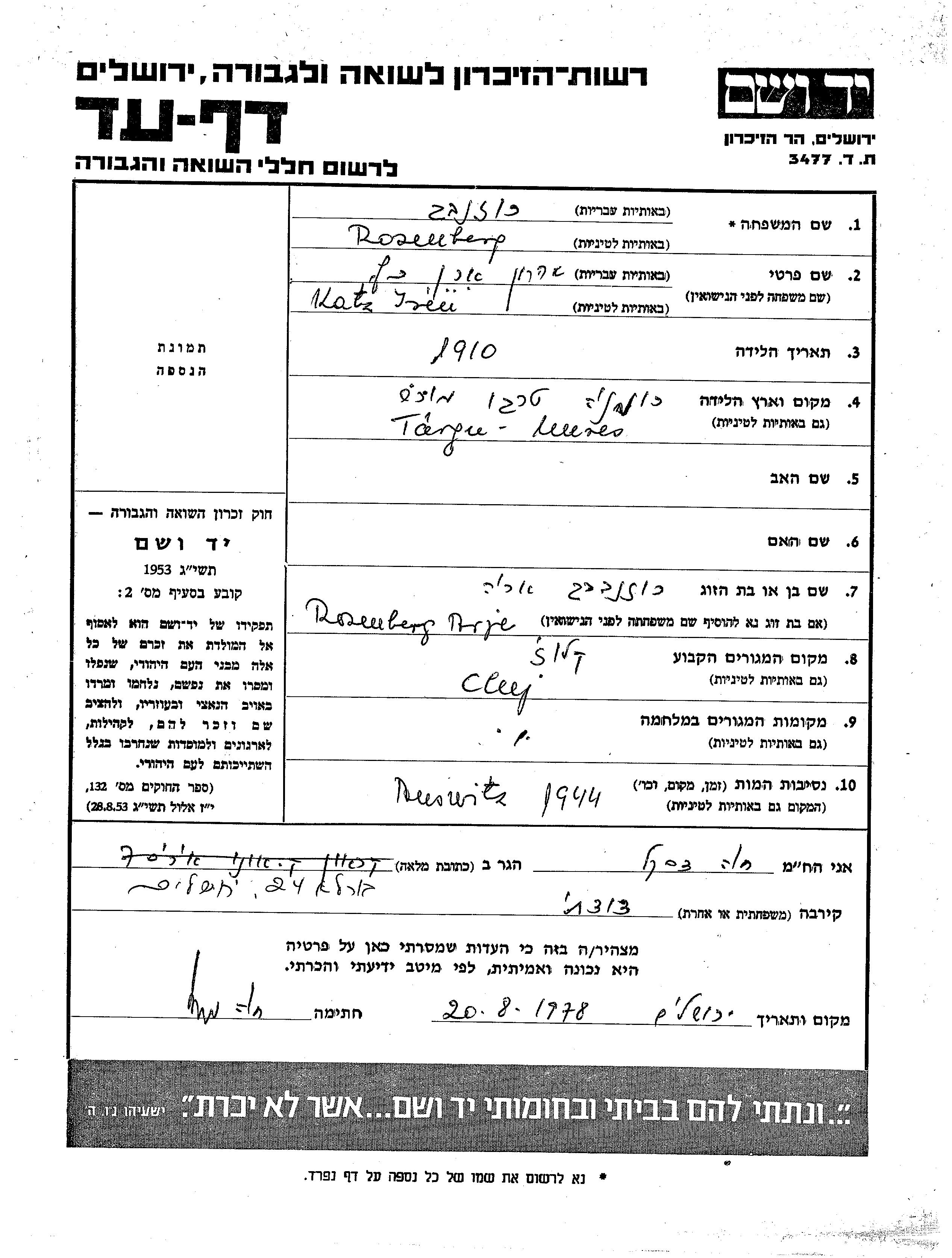 Аран Арон Ирен Розенберг, девичья фамилия Кац, место рождения: Тыргу-Муреш, Румыния. Женат / замужем. Место жительства до войны: Клуж, Румыния. Место во время войны: Клуж, Румыния.