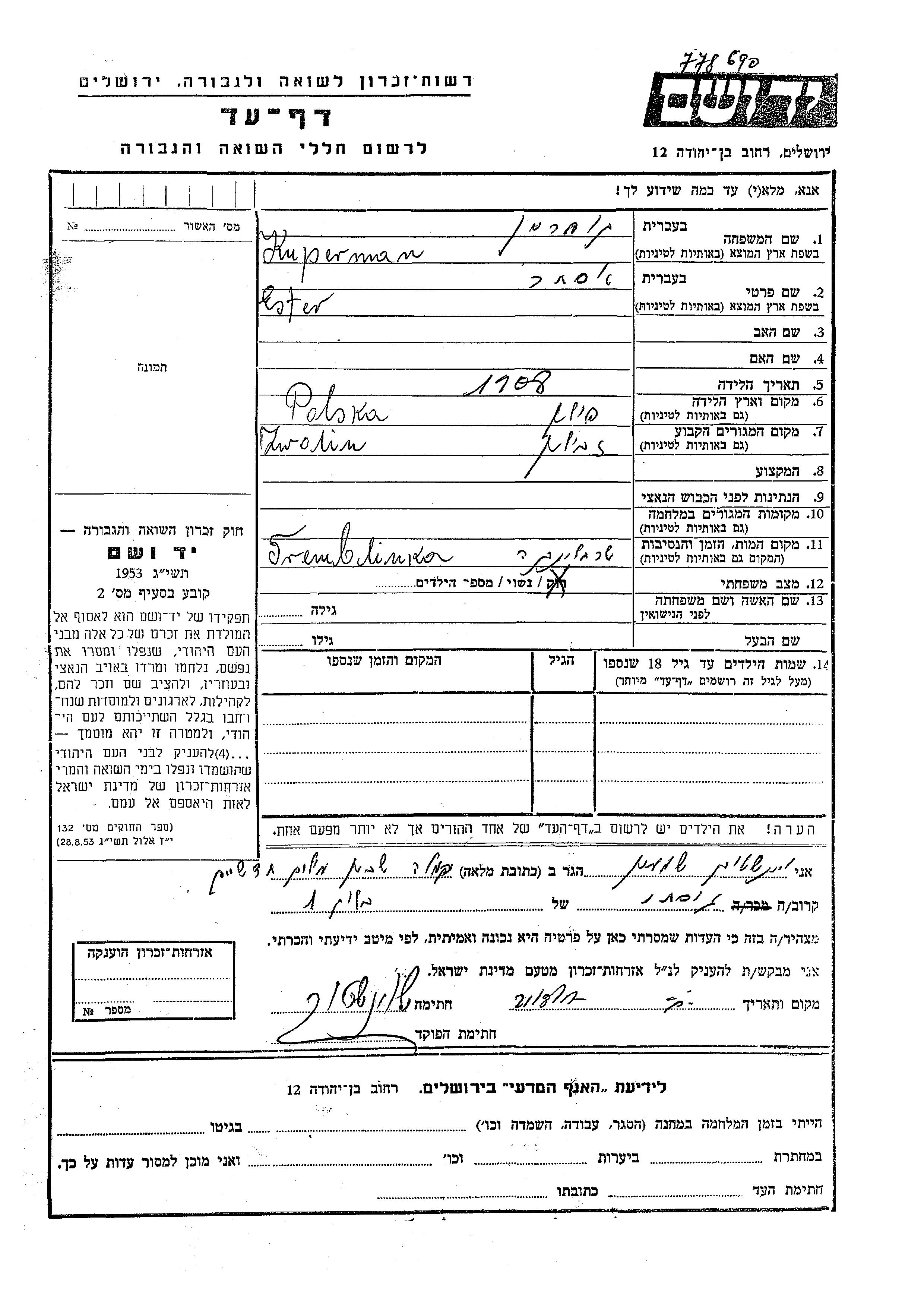 Куперман Эстер 1908 Зволин, Польша Лист свидетельских показаний