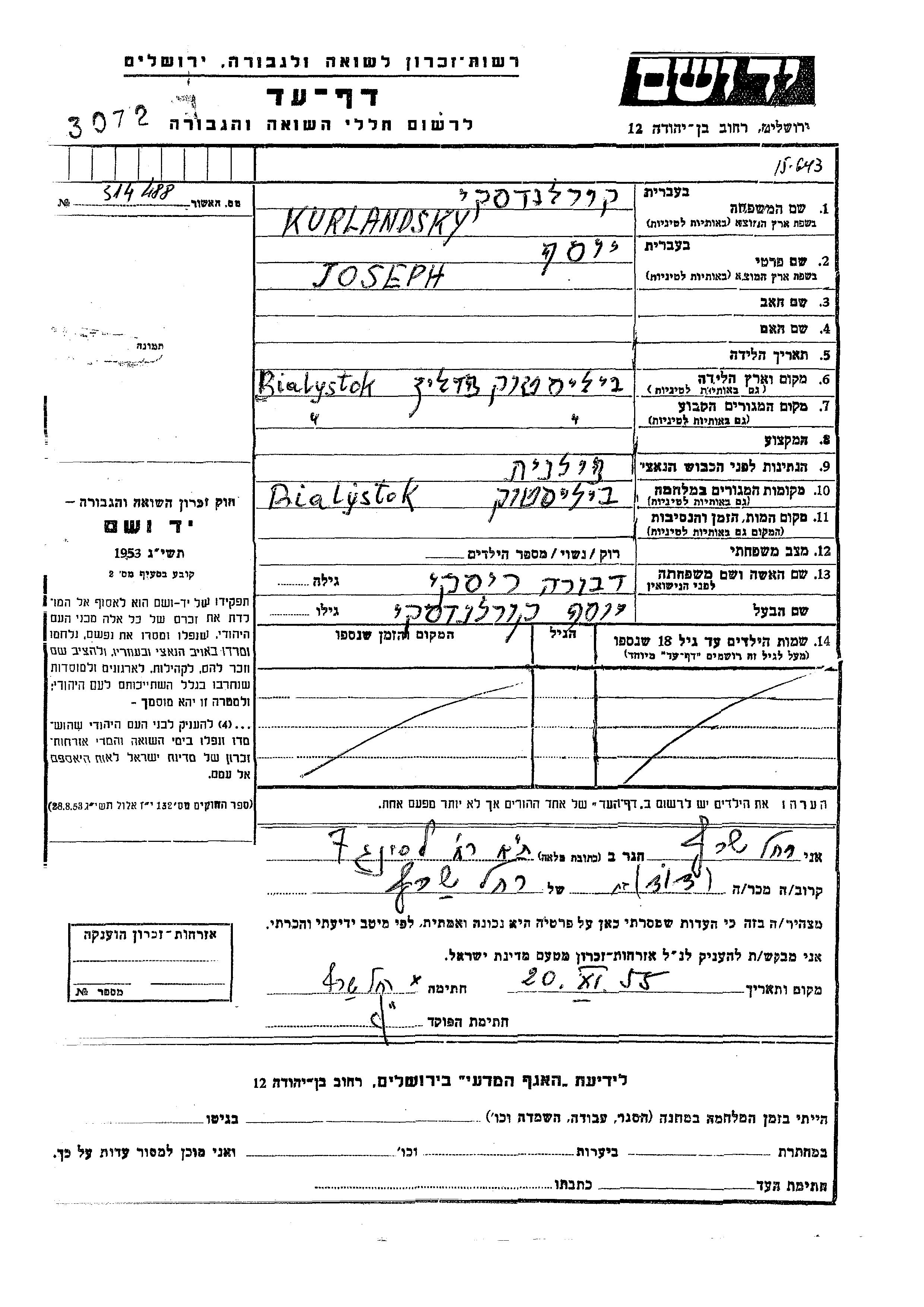 Йосеф Курландски, место рождения: Белосток, Польша. Женат / замужем. Место жительства до войны: Белосток, Польша. Место во время войны: Белосток, Польша.