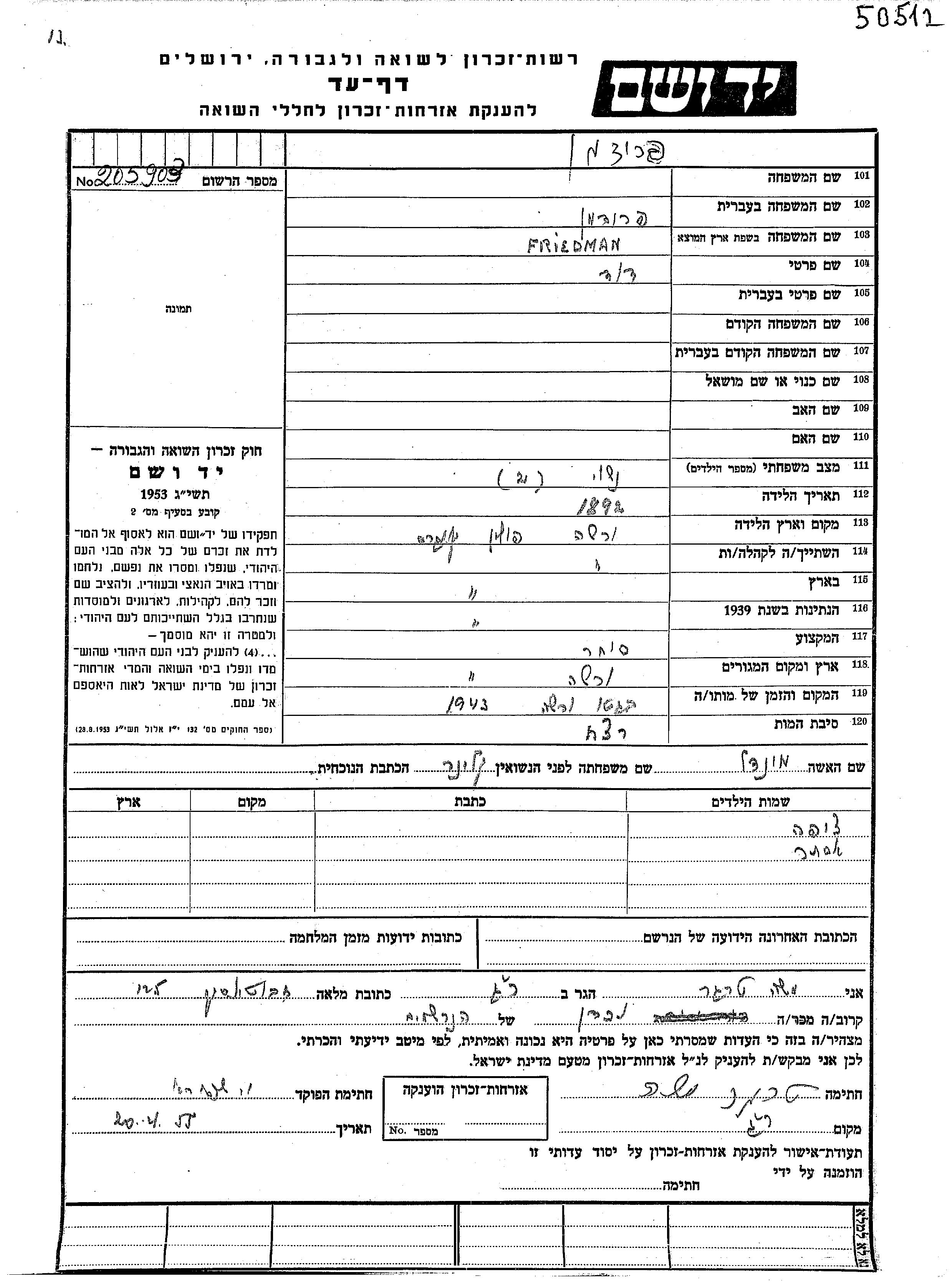 Фридман Давид 1892 Варшава, Польша Лист свидетельских показаний