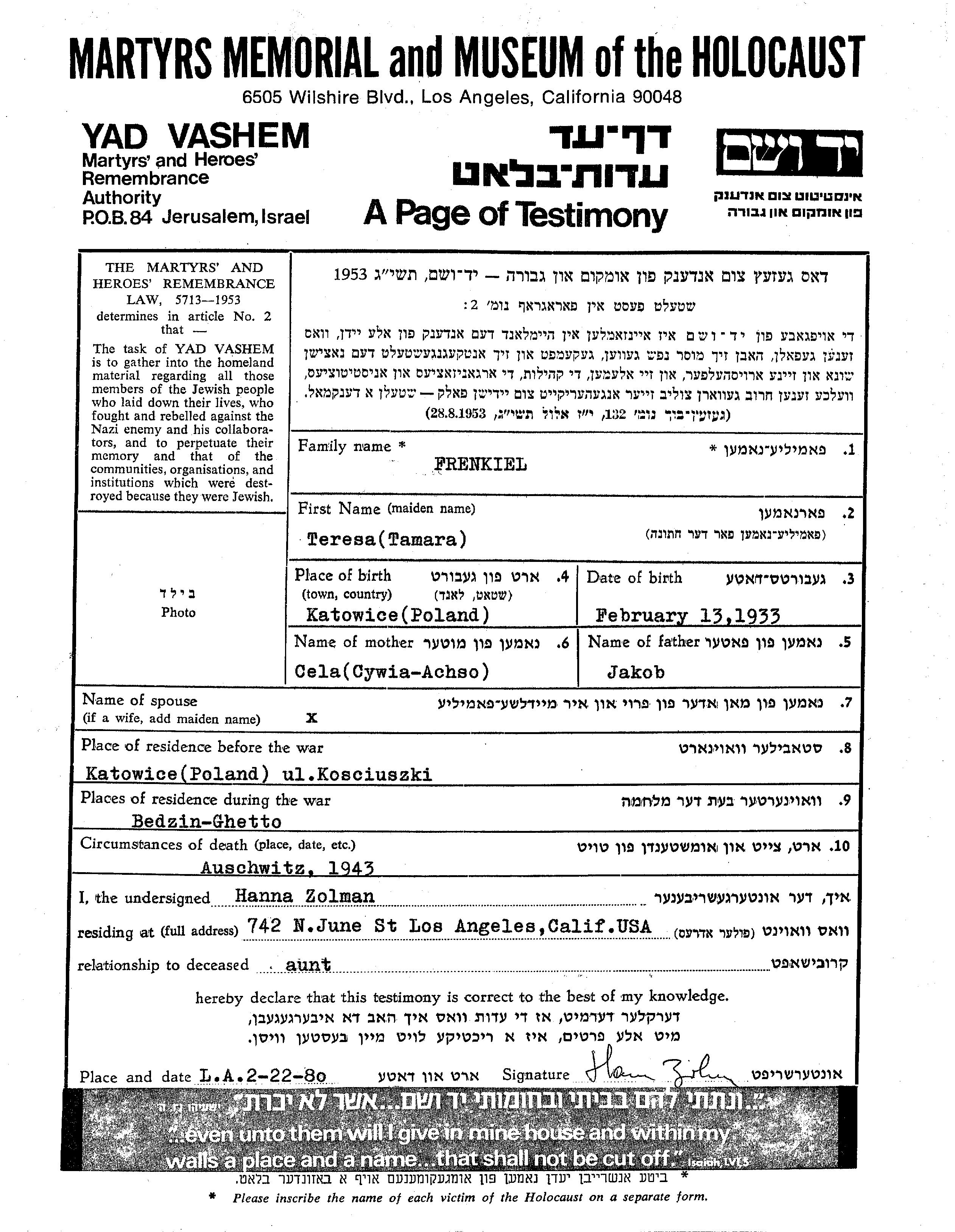 Тереза Тамара Френкель, место рождения: Катовице, Польша. Отец: Якоб, mать:Цела. Место жительства до войны: Катовице, Польша. Место во время войны: Бендзин, Польша.