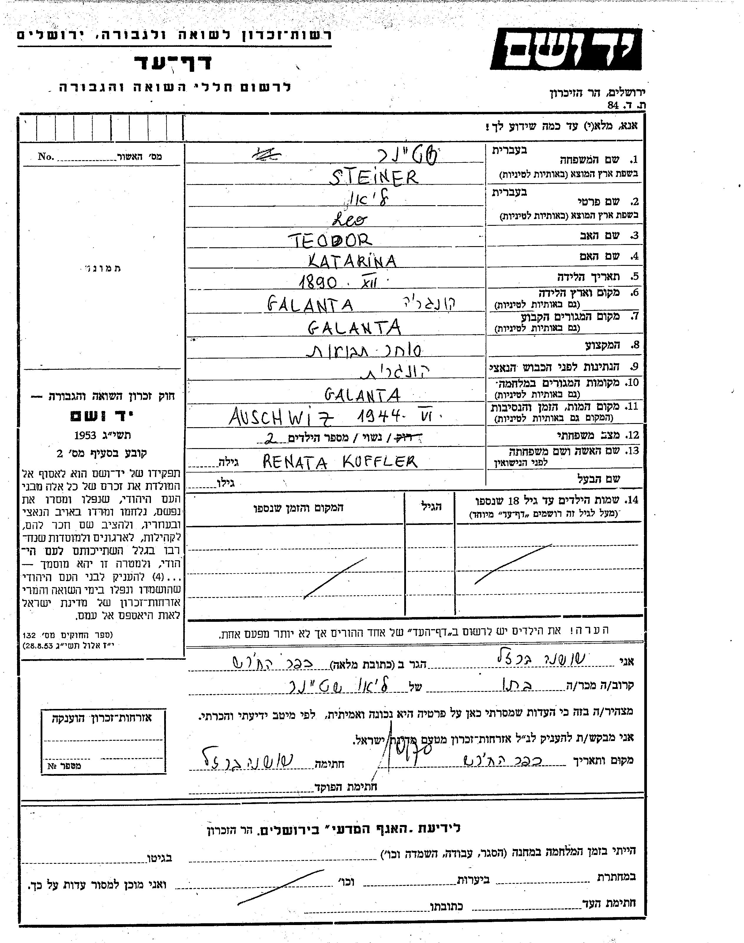 Лио Штайнер, место рождения: Галанта, Чехословакия. Отец: Теодор, mать:Катарина. Торговец зерном. Женат / замужем. Место жительства до войны: Антверпен, Бельгия. Место во время войны: Антверпен, Бельгия.