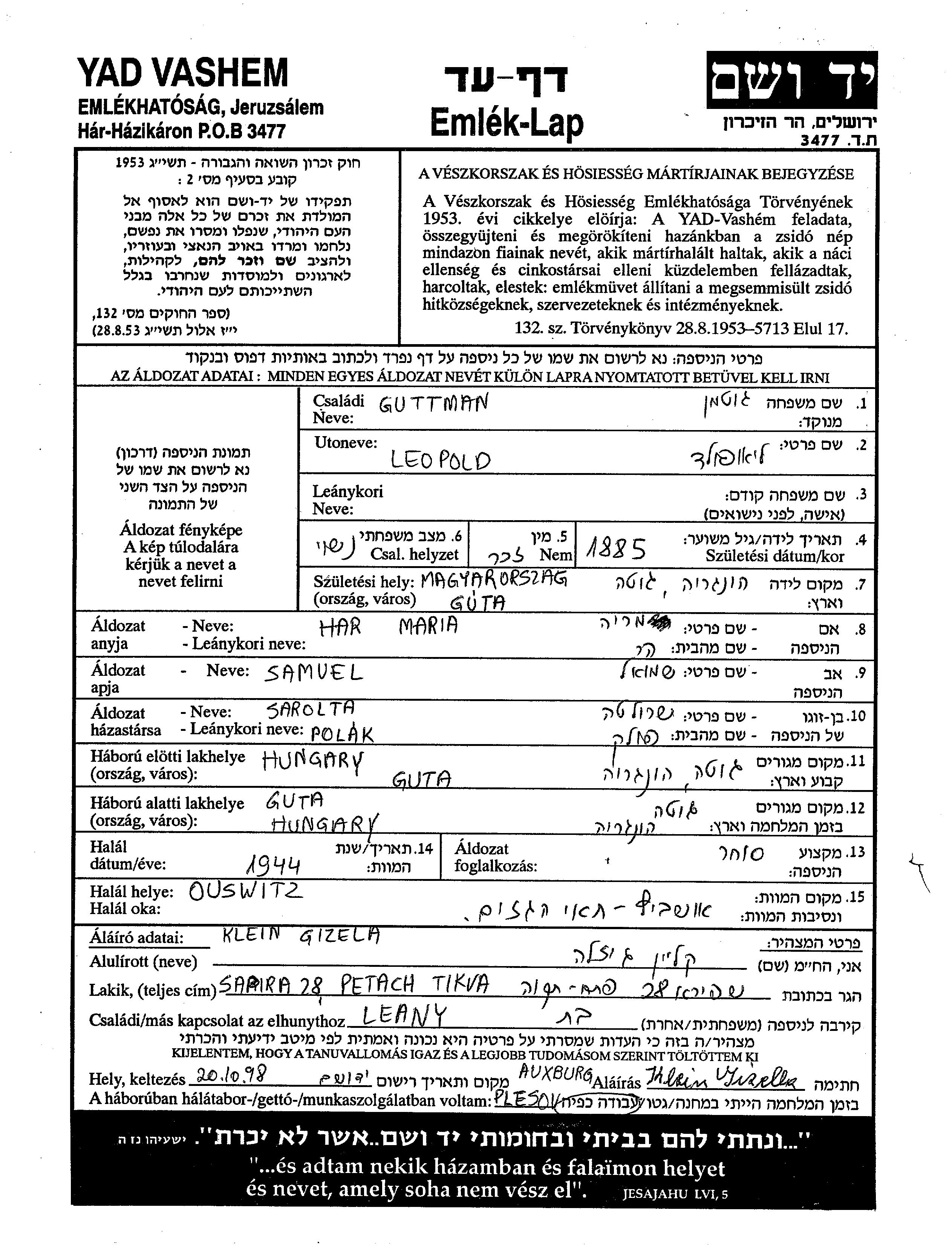 Лиопольд Гуттман, место рождения: Гута, Венгрия. Отец: Шмуэль, mать:Мария. Торговец / торговка. Женат / замужем. Место жительства до войны: Гута, Венгрия. Место во время войны: Гута, Венгрия.