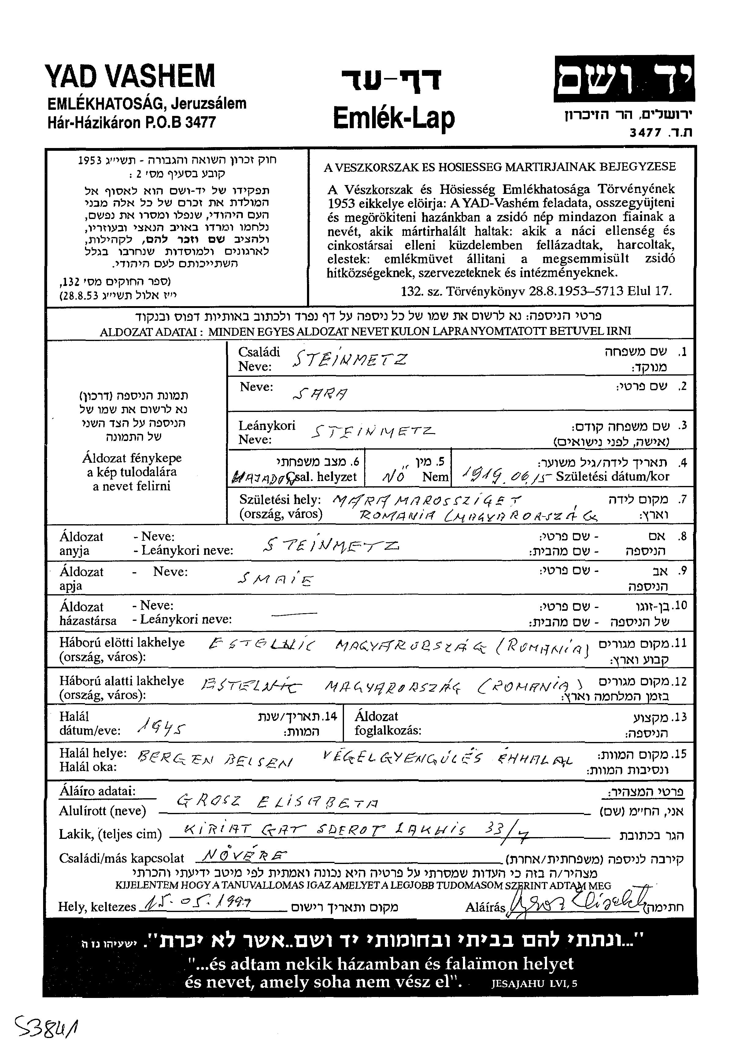 Сара Штайнмец, место рождения: Сигет, Румыния. Отец: Шмае. Холост / не замужем. Место жительства до войны: Эстельник, Румыния. Место во время войны: Эстельник, Румыния.