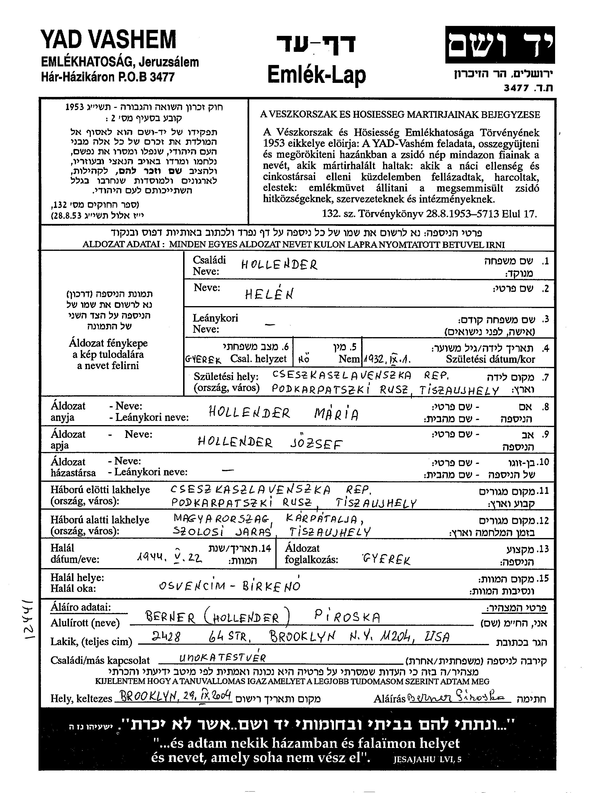 Хелен Холлендер, место рождения: Тисауйхей, Чехословакия. Отец: Йозеф, mать:Мария. Ребенок. Место жительства до войны: Тисауйхей, Чехословакия. Место во время войны: Тисауйхей, Чехословакия.