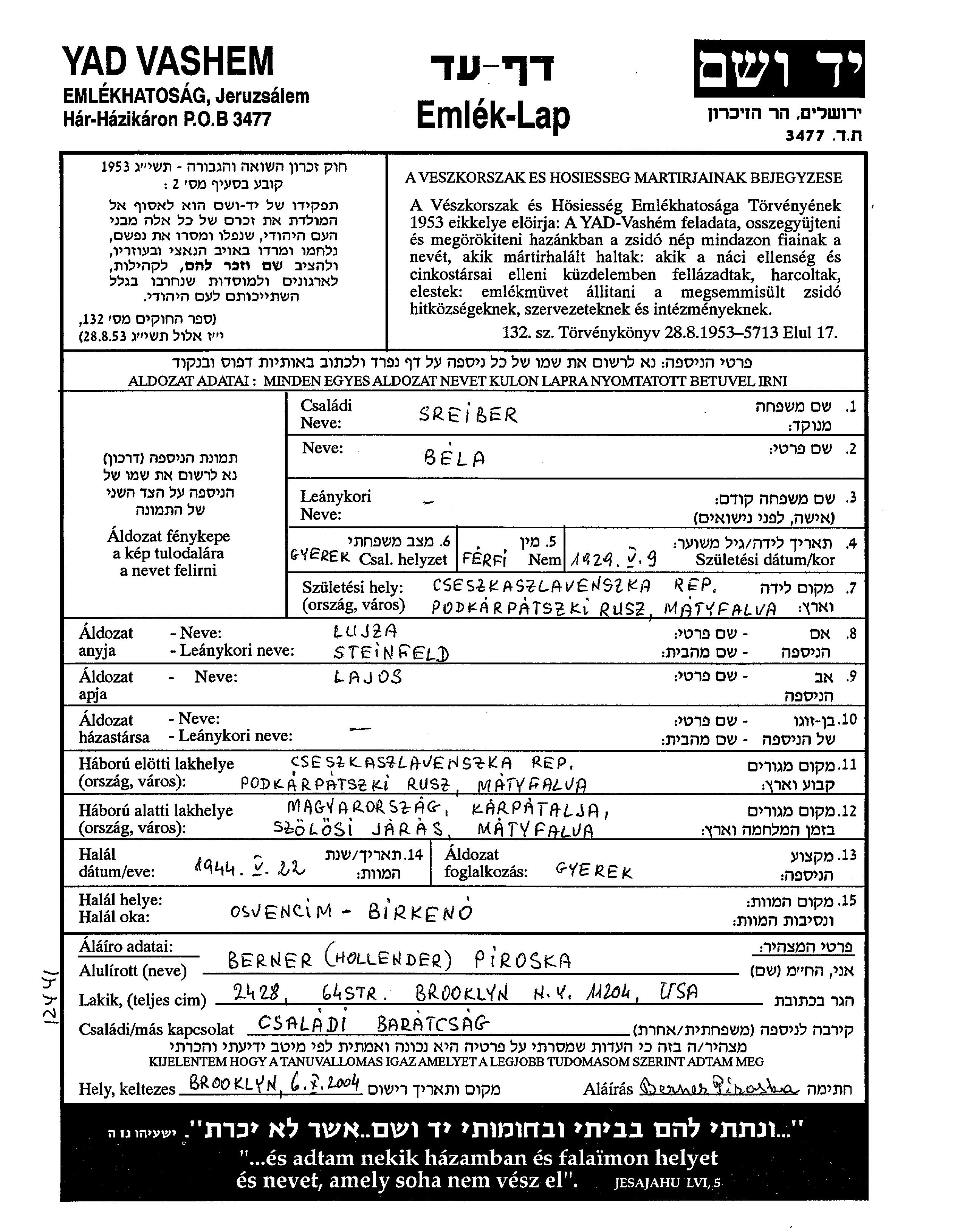 Бела Шрайбер, место рождения: Матьфальва, Чехословакия. Отец: Лайош, mать:Луиза, девичья фамилия Штайнфельд. Ребенок. Место жительства до войны: Матьфальва, Чехословакия. Место во время войны: Матьфальва, Чехословакия.