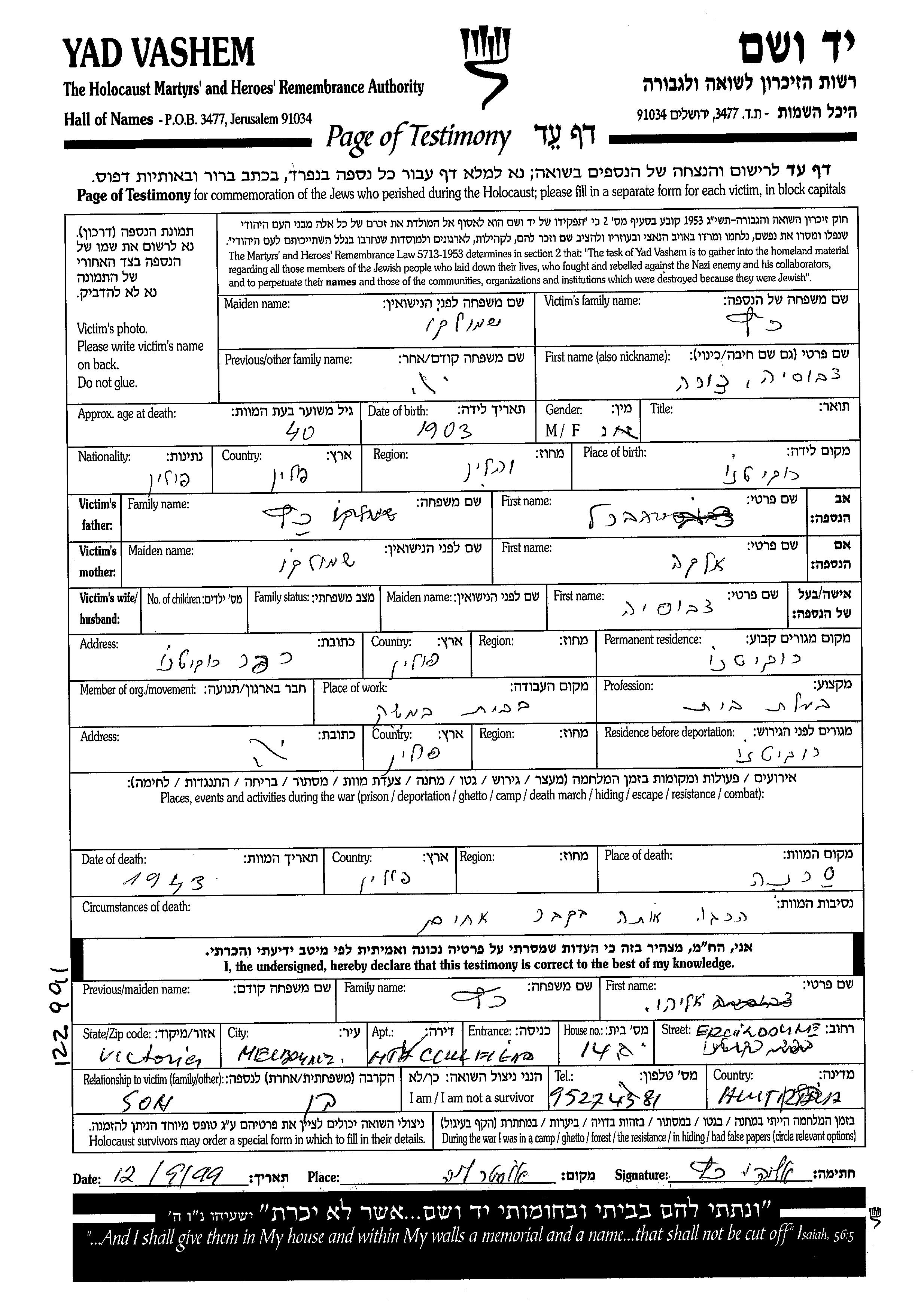 Яд Вашем - Листы свидетельских показаний Мемориального фонда