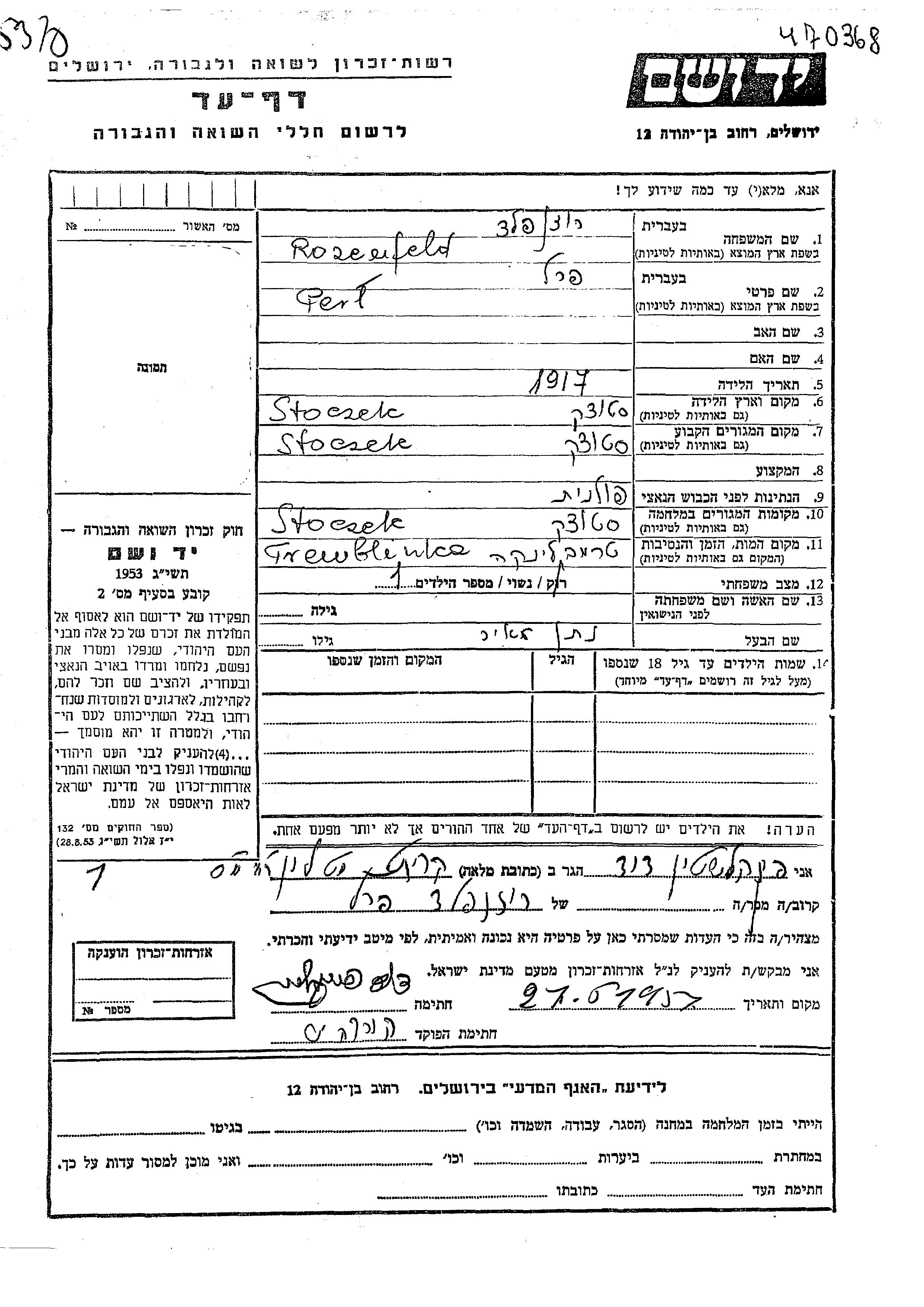 Перл Розенфельд, место рождения: Сточек, Польша. Женат / замужем. Место жительства до войны: Сточек, Польша. Место во время войны: Сточек, Польша.