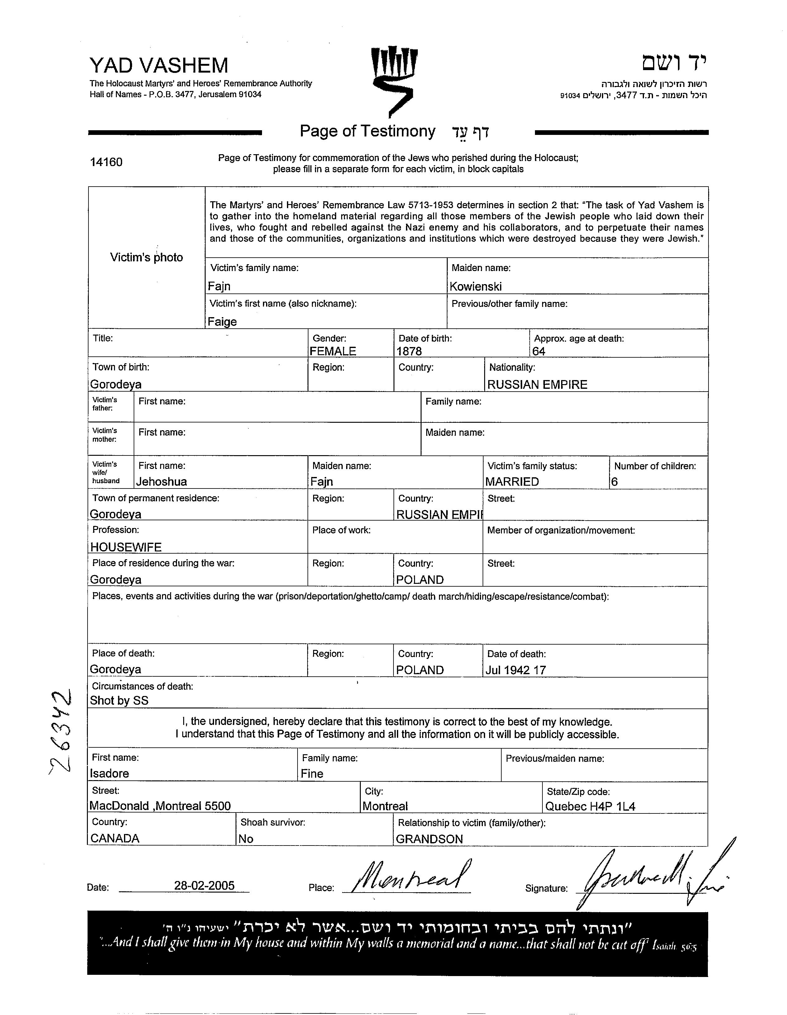 Файге Файн, девичья фамилия Ковенски, место рождения: Городея, Польша. Женат / замужем. Место жительства до войны: Городея, Польша. Место во время войны: Городея, Польша. Файге уничтоженa в период Шоа. место смерти: Городея, Польша в 17/07/1942.