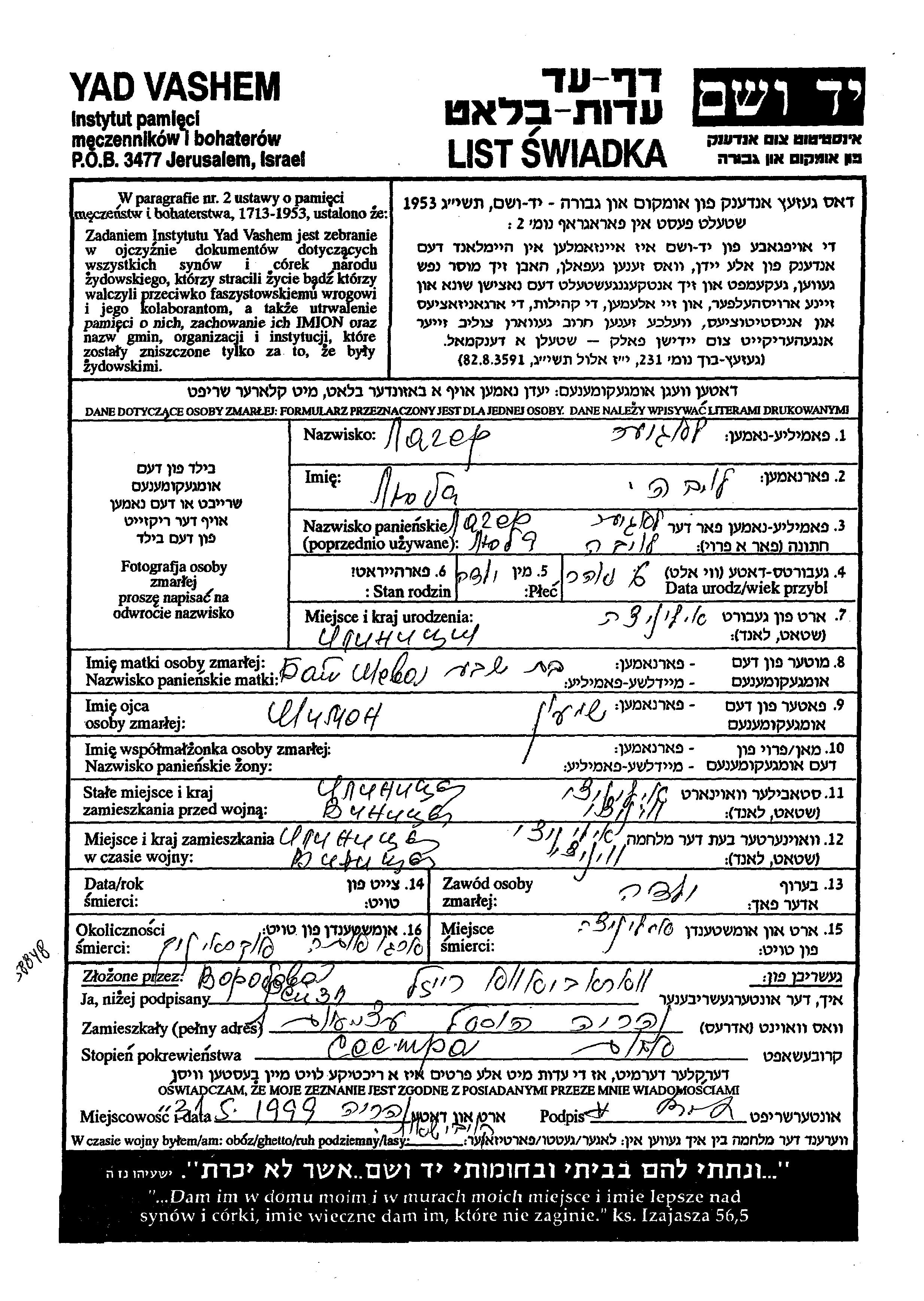 Яд Вашем - Листы свидетельских показаний Мемориального фонда