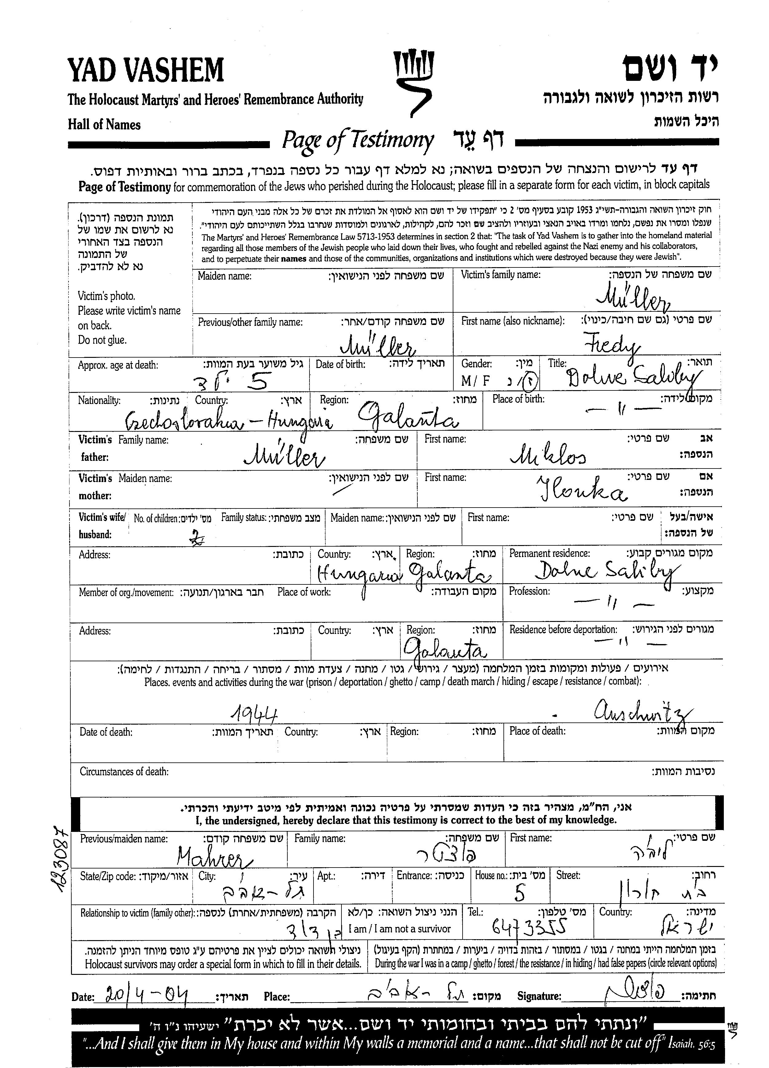 Фреди Муллер, место рождения: Долне Салиби, Чехословакия. Отец: Миклош, mать:Илонка. Ребенок. Место жительства до войны: Долне Салиби, Чехословакия. Место во время войны: Долне Салиби, Чехословакия.