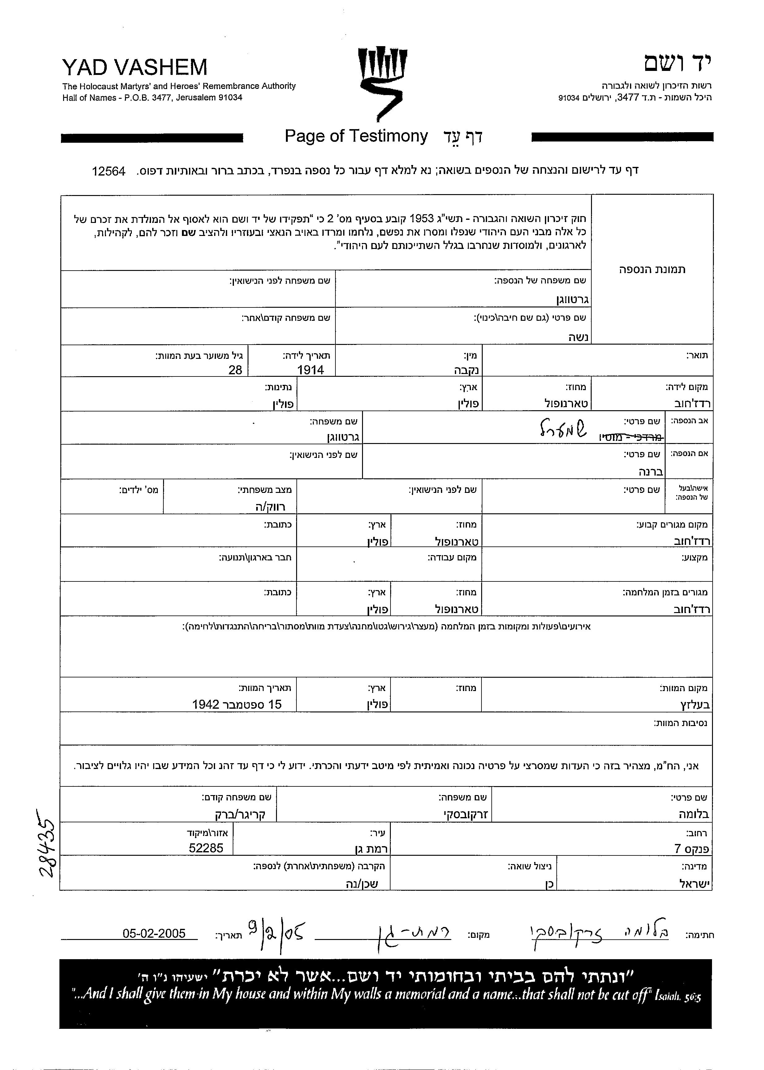 Неша Гертваген, место рождения: Радзехов, Польша. Отец: Шмерл, mать:Брана. Холост / не замужем. Место жительства до войны: Радзехов, Польша. Место во время войны: Радзехов, Польша. Неша уничтоженa в период Шоа. место смерти: Белжец, Польша в 15/09/1942.