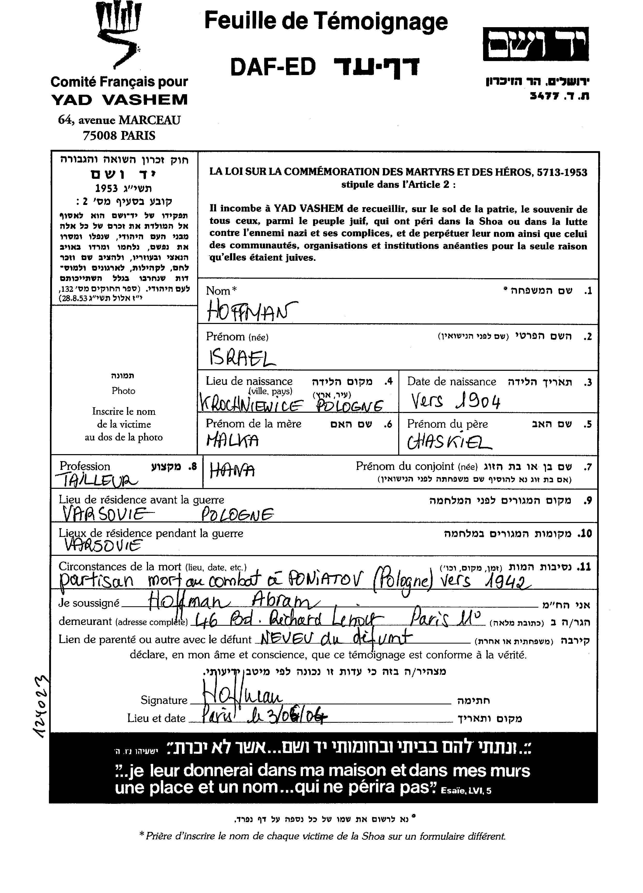 Исраэль Хоффман, место рождения: Кросневице, Польша. Отец: Хаскель, mать:Малка. Место жительства до войны: Варшава, Польша. Место во время войны: Варшава, Польша.