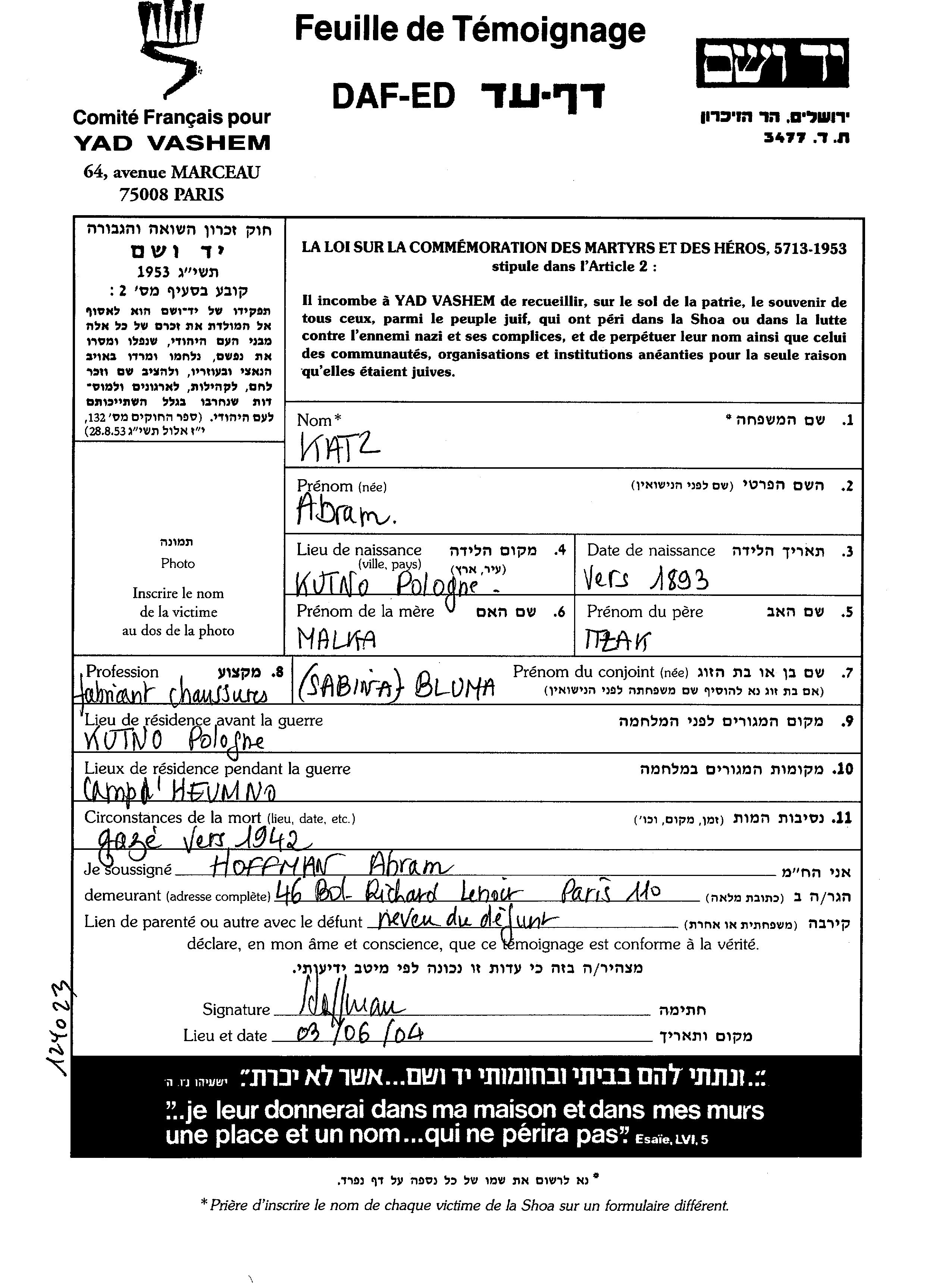 Абрам уничтожен в период Шоа. место смерти: неизвестно в 1942.