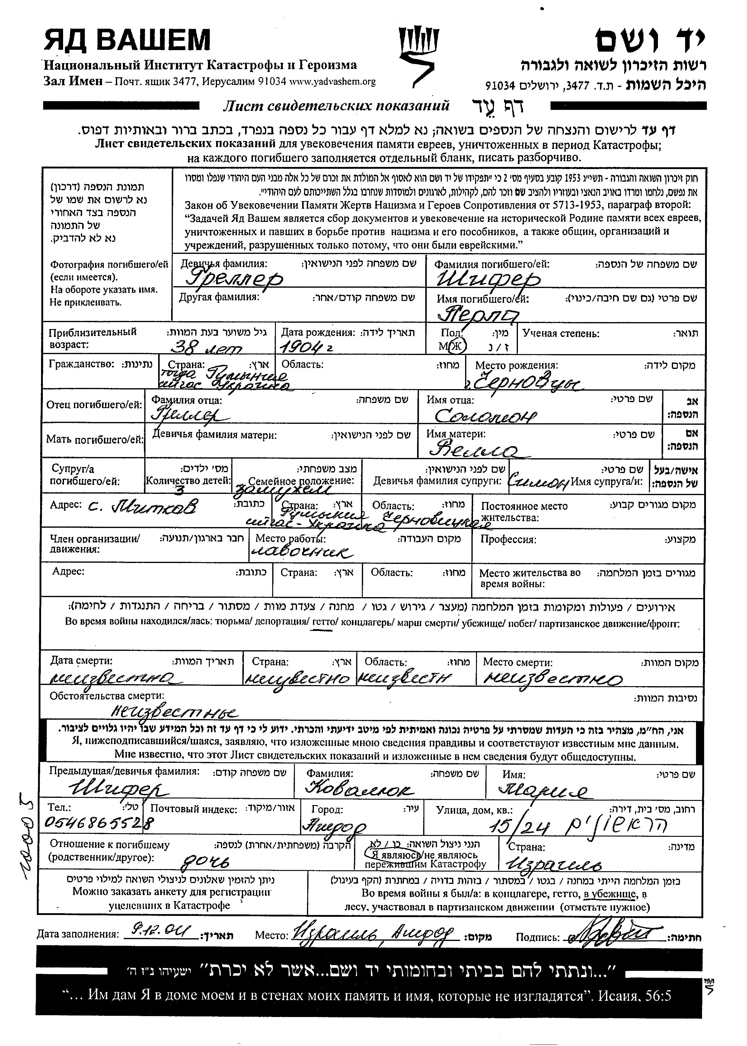 Яд Вашем - Листы свидетельских показаний Мемориального фонда
